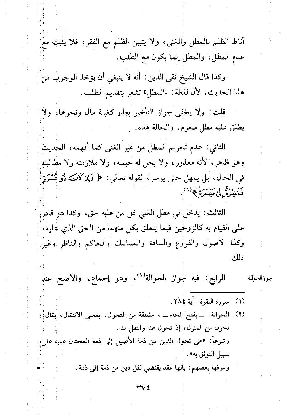 الثاني: عدم تحريم المطل من غير الغنى كما أفهمه، الحديث وهو ظاهر, لأنه معذور، ولا يحل له حبسه، ولا ملازمته ولا مطالبته في الحال، بل يمهل حتى يوسر، لقوله تعالى: {وَإِنْ كَانَ ذُو عُسْرَةٍ فَنَظِرَةٌ إِلَى مَيْسَرَةٍ} (¬1).