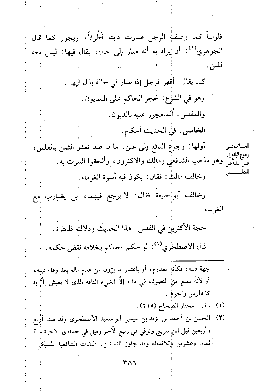 أولها: رجوع البائع إلى عين، ما له عند تعذر الثمن بالفلس، وهو مذهب الشافعي ومالك والأكثرون، وألحقوا الموت به.