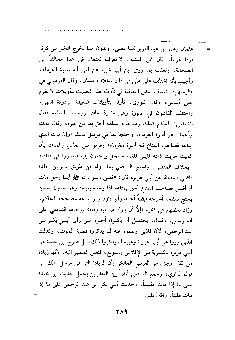 = عثمان وعمر بن عبد العزيز كما مضى، وبدون هذا يخرج الخبر عن كونه فردا غريبًا، قال ابن المنذر: لا نعرف لعثمان في هذا مخالفًا من الصحابة. وتعقب بما روى ابن أبي شيبة عن علي أنه أسوة الغرماء، وأجيب بأنه اختلف على علي في ذلك بخلاف عثمان، وقال القرطبي في "الرمفهم": تعسف بعض الحنفية في تأويله هذا الحديث بتأويلات لا تقوم على أساس، وقال النووي: تأوله بتأويلات ضعيفة مردودة انتهى، واختلف القائلون في صورة وهي ما إذا مات ووجدت السلعة فقال الشافعي: الحكم كذلك وصاحب السلعة أحق بها من غيره، وقال مالك وأحمد: هو أسوة الغرماء، واحتجا بما في مرسل مالك "وإن مات الذي ابتاعه فصاحب المتاع فيه أسوة الغرماء" وفرقوا بين الفلس والموت بأن الميت خربت ذمته فليس للغرماء محل يرجعون إليه فاستووا في ذلك، بخلاف المفلس. واحتج الشافعي بما رواه من طريق عمر بن خلدة قاضي المدينة عن أبي هريرة قال: "قضى رسول الله - صلى الله عليه وسلم - أيما رجل مات أو أفلس فصاحب المتاع أحق بمتاعه إذا وجده بعينه" وهو حديث حسن يحتج بمثله، أخرجه أيضًا أحمد وأبو داود وابن ماجه وصححه الحاكم، وزاد بعضهم في آخره "إلَّا أن يترك صاحبه وفاء" ورجحه الشافعي على المرسل، وقال: يحتمل أن يكون آخره من رأى أبي بكر بن عبد الرحمن، لأن الذين وصلوه عنه لم يذكروا قضية الموت، وكذلك الذين رووا عن أبي هريرة وغيره لم يذكروا ذلك، بل صرح ابن خلدة عن أبي هريرة بالتسوية بين الإفلاس والموتع، فتعين المصير إليه, لأنها زيادة من ثقة. وجزم ابن العربي المالكي بأن الزيادة التي في مرسل مالك من قول الراوي، وجمع الشافعي أيضًا بين الحديثين بحمل حديث ابن خلدة على ما إذا مات مفلسًا، وحديث أبي بكر ابن عبد الرحمن على ما إذا مات مليئًا. والله أعلم. =