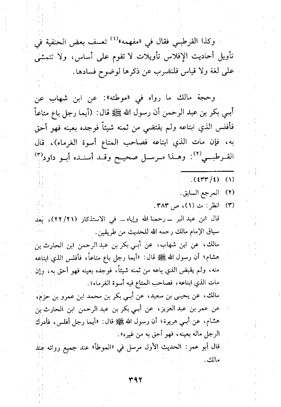 مالك، عن ابن شهاب، عن أبي بكر بن عبد الرحمن ابن الحارث بن هشام؛ أن رسول الله - صلى الله عليه وسلم - قال: "أيما رجل باع متاعًا، فأفلس الذي ابتاعه منه، ولم يقبض الذي باعه من ثمنه شيئًا، فوجده بعينه فهو أحق به، وإن مات الذي ابتاعه، فصاحب المتاع فيه أسوة الغرماء".