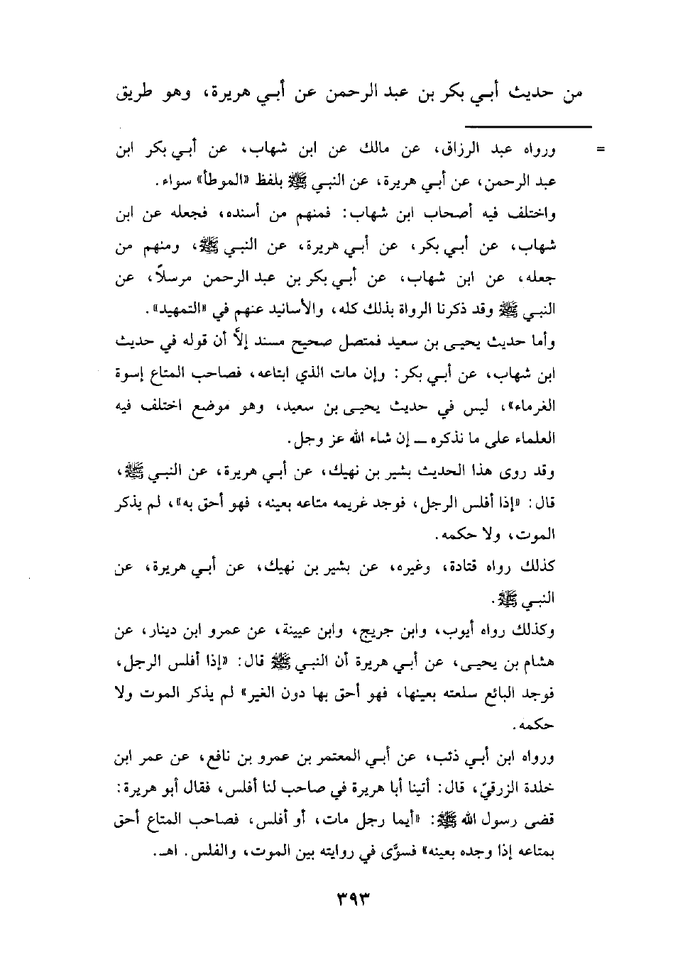 وأما حديث يحيى بن سعيد فمتصل صحيح مسند إلَّا أن قوله في حديث ابن شهاب، عن أبي بكر: وإن مات الذي ابتاعه، فصاحب المتاع إسوة الغرماء"، ليس في حديث يحيى بن سعيد، وهو موضع اختلف فيه العلماء على ما نذكره -إن شاء الله عز وجل.
