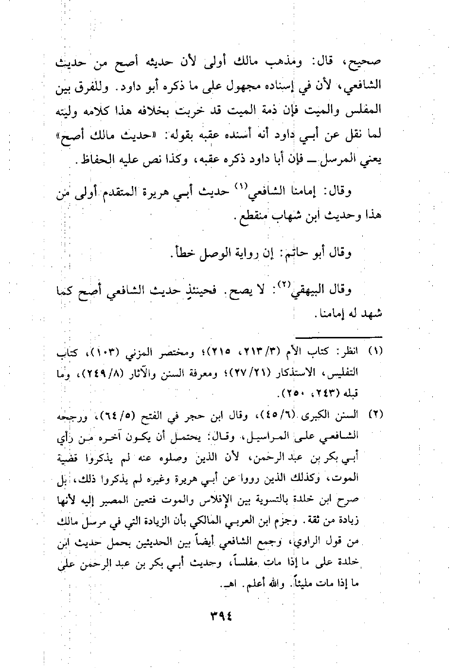 (¬2) السنن الكبرى (6/ 45)، وقال ابن حجر في الفتح (5/ 64)، ورجحه الشافعي على المراسيل، وقال: يحتمل أن يكون آخره من رأي أبي بكر بن عبد الرحمن, لأن الذين وصلوه عنه لم يذكروا قضية الموت، وكذلك الذين رووا عن أبي هريرة وغيره لم يذكروا ذلك، بل صرح ابن خلدة بالتسوية بين الإفلاس والموت فتعين المصير إليه لأنها زيادة من ثقة. وجزم ابن العربي المالكي بأن الزيادة التي في مرسل مالك من قول الراوي، وجمع الشافعي أيضًا بين الحديثين بحمل حديث ابن خلدة على ما إذا مات مفلسًا، وحديث أبي بكر بن عبد الرحمن على ما إذا مات مليئًا. والله أعلم. اهـ.