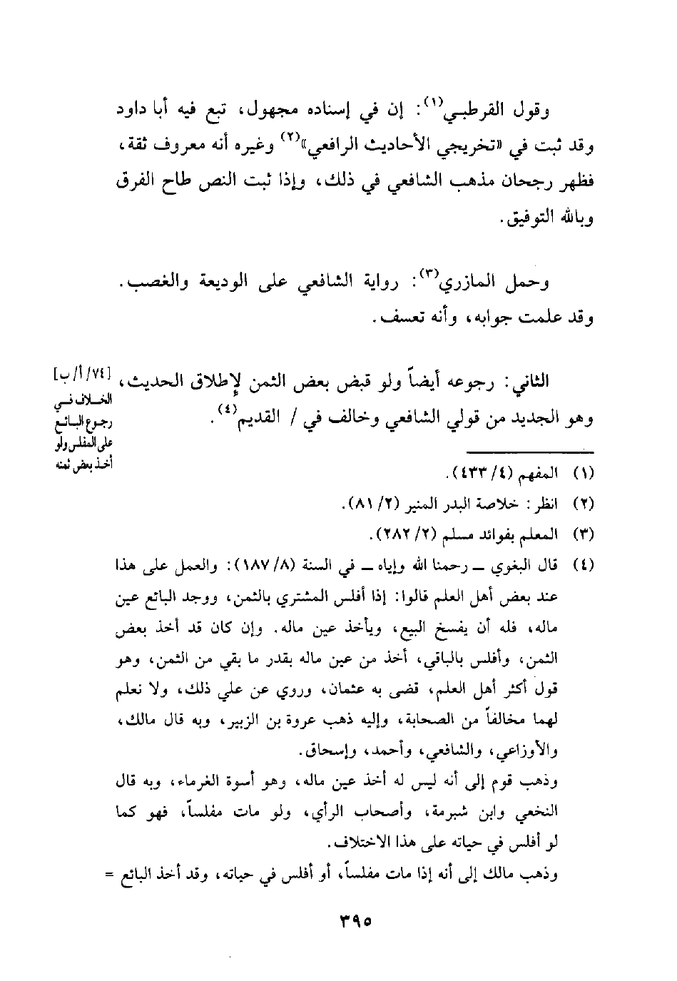 (¬4) قال البغوي -رحمنا الله وإياه- في السنة (8/ 187): والعمل على هذا عند بعض أهل المعلم قالوا: إذا أفلس المشتري بالثمن، ووجد البائع عين ماله، فله أن يفسخ البيع، ويأخذ عين ماله. وإن كان قد أخذ بعض الثمن، وأفلس بالباقي، أخذ من عين ماله بقدر ما بقي من الثمن، وهو قول أكثر أهل العلم، قضى به عثمان، وروي عن علي ذلك، ولا نعلم لهما مخالفًا من الصحابة، وإليه ذهب عروة بن الزبير، وبه قال مالك، والأوزاعي، والشافعي، وأحمد، وإسحاق.