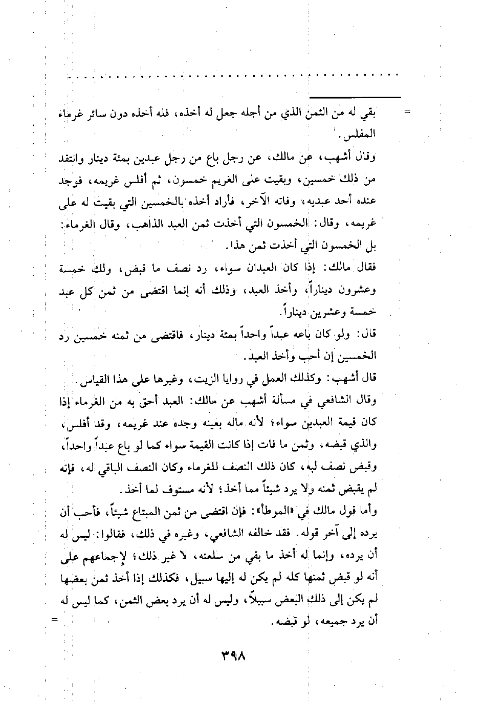 وقال الشافعي في مسألة أشهب عن مالك: العبد أحق به من الغرماء إذا كان قيمة العبدين سواء؛ لأنه ماله بعينه وجده عند غريمه، وقد أفلس، والذي قبضه، وثمن ما فات إذا كانت القيمة سواء كما لو باع عبدًا واحدًا، وقبض نصف لبه، كان ذلك النصف للغرماء وكان النصف الباقي له، فإنه لم يقبض ثمنه ولا يرد شيئًا مما أخذ؛ لأنه مستوف لما أخذ.