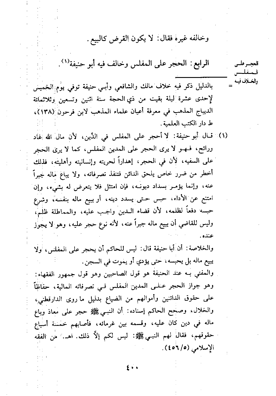 (¬1) قال أبو حنيفة: لا أحجر على المفلس في الدين, لأن مال الله غاد ورائح، فهو لا يرى الحجر على المدين المفلس، كما لا يرى الحجر على السفيه، لأن في الحجر، إهدارًا لحريته وإنسانيته وأهليته، فذلك أخطر من ضرر خاص يلحق الدائن فتنفذ تصرفاته ولا يباع ماله جبرًا عنه، وإنما يؤمر بسداد ديونه، فإن امتثل فلا يتعرض له بشيء، وإن امتنع عن الأداء، حبس حتى يسدد دينه، أو يبيع ماله بنفسه، وشرع حبسه دفعًا لظلمه, لأن قضاء الدين واجب عليه، والمماطلة ظلم، وليس للقاضي أن يبيع ماله جبرًا عنه، لأنه نوع حجر عليه، وهو لا يجوز عنده.