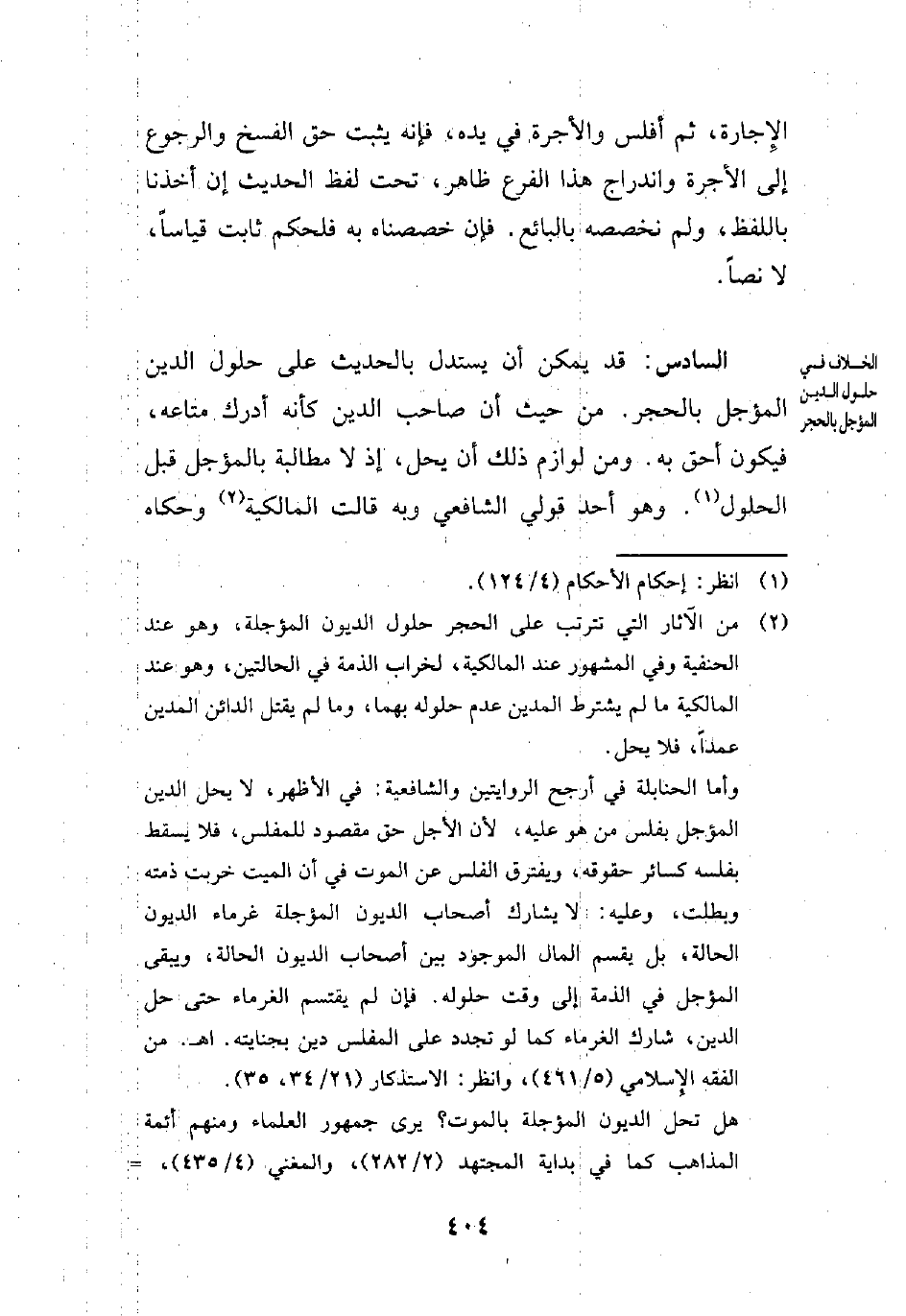 السادس: قد يمكن أن يستدل بالحديث على حلول الدين المؤجل بالحجر. من حيث أن صاحب الدين كأنه أدرك متاعه، فيكون أحق به. ومن لوازم ذلك أن يحل، إذ لا مطالبة بالمؤجل قبل الحلول (¬1). وهو أحد قولي الشافعي وبه قالت المالكية (¬2) وحكاه