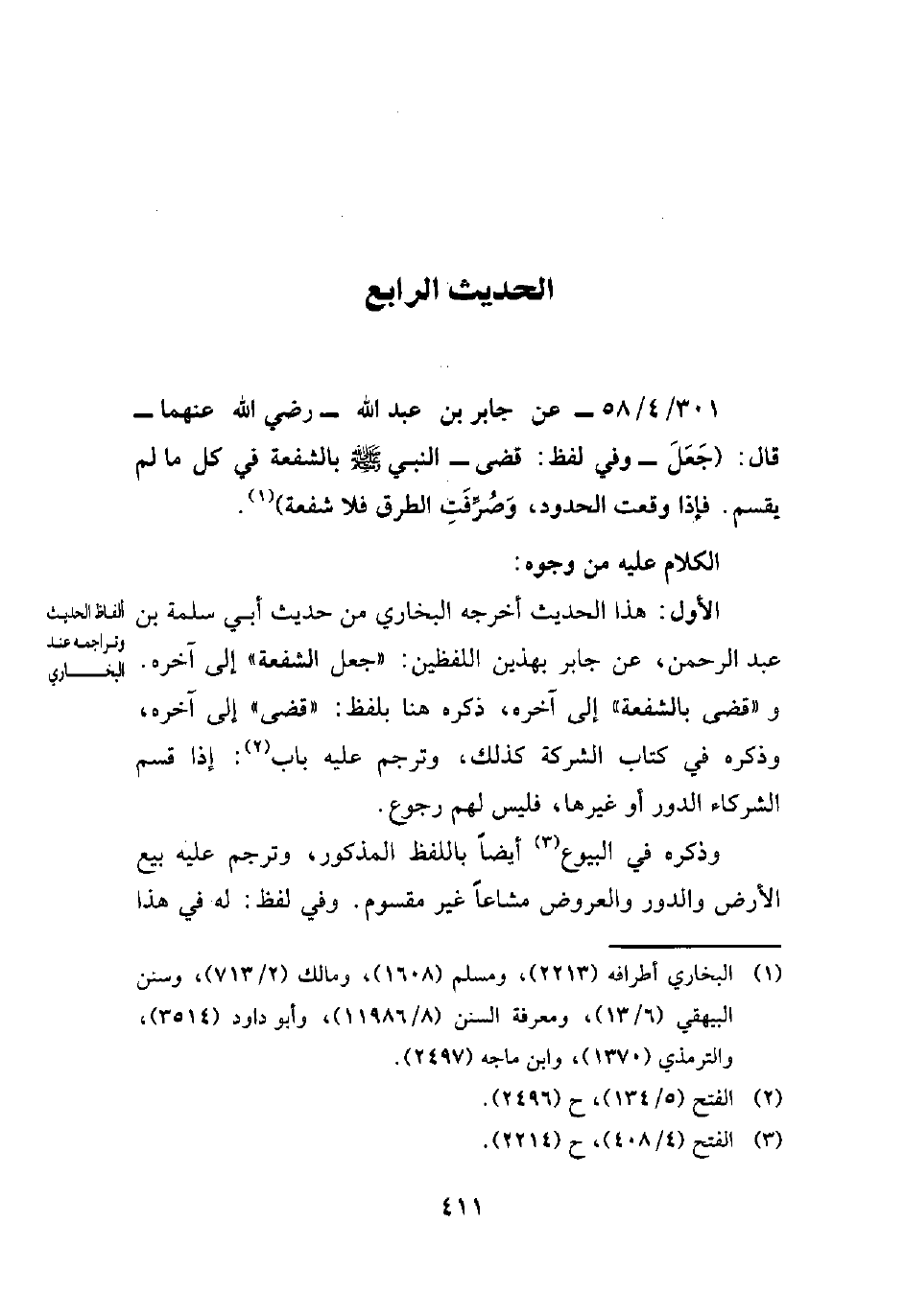 301/ 4/ 58 - عن جابر بن عبد الله -رضي الله عنهما- قال: (جَعَلَ -وفي لفظ: قضى- النبي - صلى الله عليه وسلم - بالشفعة في كل ما لم يقسم. فإذا وقعت الحدود، وَصُرِّفَتِ الطرق فلا شفعة) (¬1).