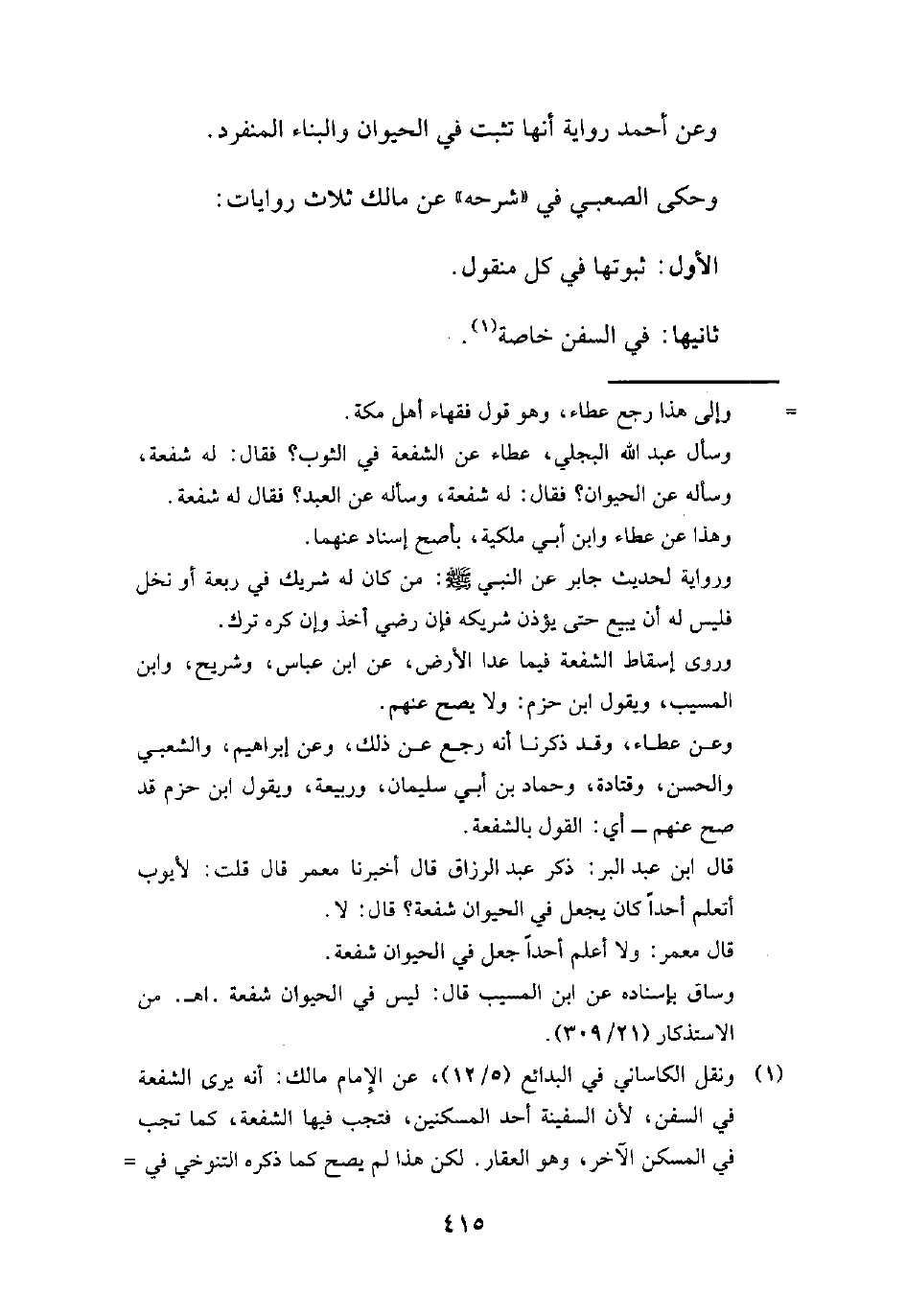 (¬1) ونقل الكاساني في البدائع (5/ 12)، عن الإِمام مالك: أنه يرى الشفعة في السفن, لأن السفينة أحد المسكنين، فتجب فيها الشفعة، كما تجب في المسكن الآخر، وهو العقار. لكن هذا لم يصح كما ذكره التنوخي في =