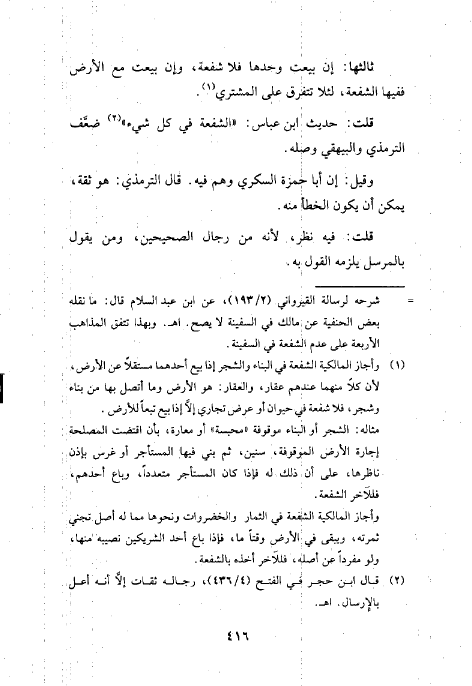 (¬1) وأجاز المالكية الشفعة في البناء والشجر إذا بيع أحدهما مستقلًا عن الأرض، لأن كلًا منهما عندهم عقار، والعقار: هو الأرض وما اتصل بها من بناء وشجر، فلا شفعة في حيوان أو عرض تجاري إلَّا إذا بيع تبعًا للأرض.