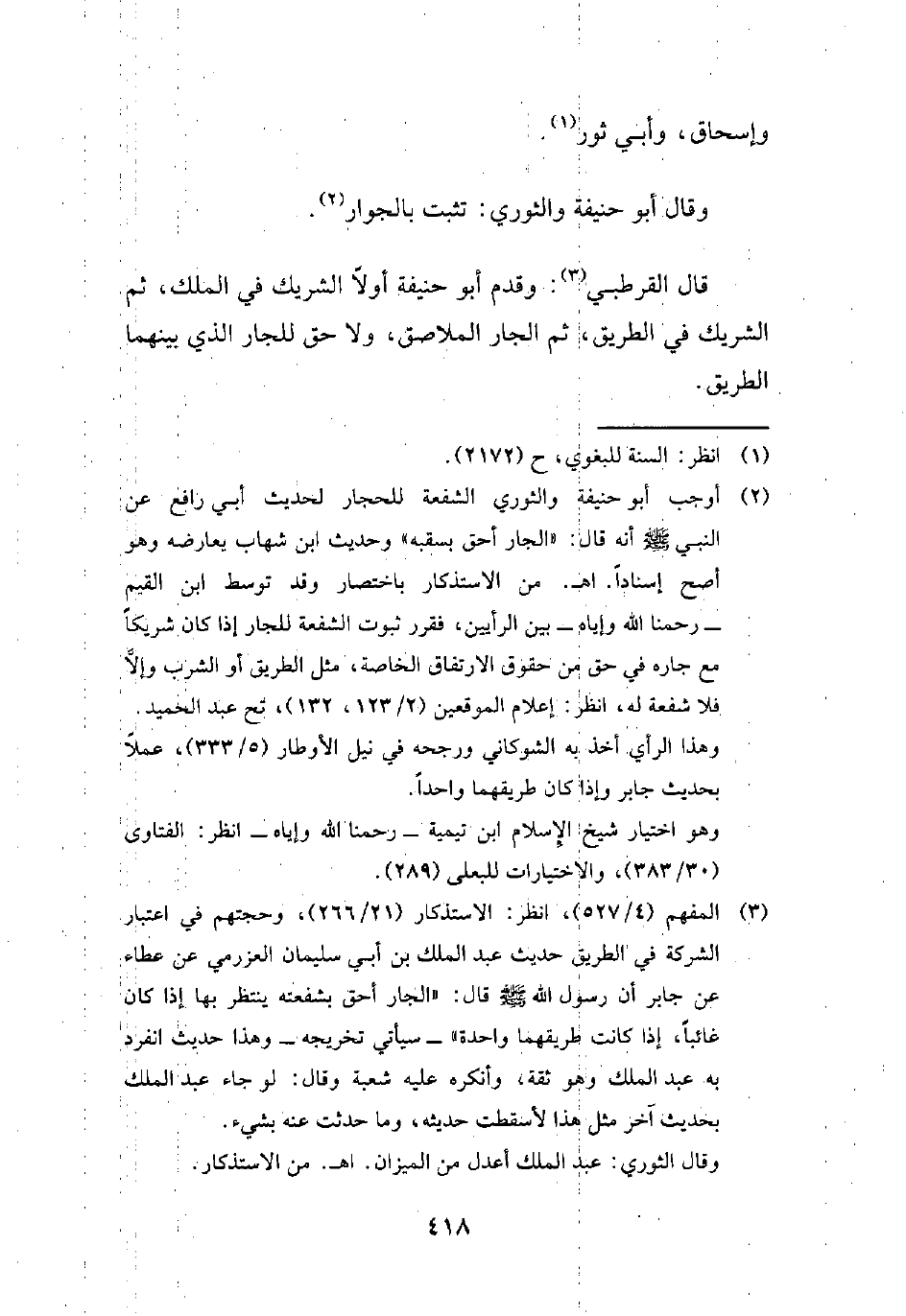 (¬3) المفهم (4/ 527)، انظر: الاستذكار (21/ 266)، وحجتهم في اعتبار الشركة في الطريق حديث عبد الملك بن أبي سليمان العزرمي عن عطاء عن جابر أن رسول الله - صلى الله عليه وسلم - قال: "الجار أحق بشفعته ينتظر بها إذا كان غائبًا، إذا كانت طريقهما واحدة" -سيأتي تخريجه- وهذا حديث انفرد به عبد الملك وهو ثقة، وأنكره عليه شعبة وقال: لو جاء عبد الملك بحديث آخر مثل هذا لأسقطت حديثه، وما حدثت عنه بشيء.