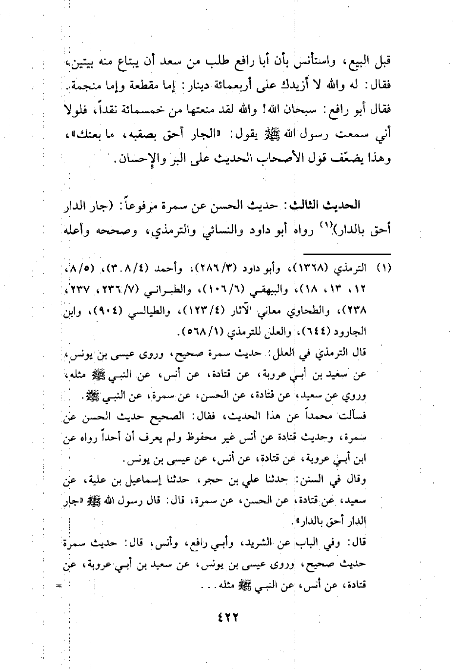 وقال في السنن: حدثنا علي بن حجر، حدثنا إسماعيل بن علية، عن سعيد، عن قتادة، عن الحسن، عن سمرة، قال: قال رسول الله - صلى الله عليه وسلم - "جار الدار أحق بالدار".