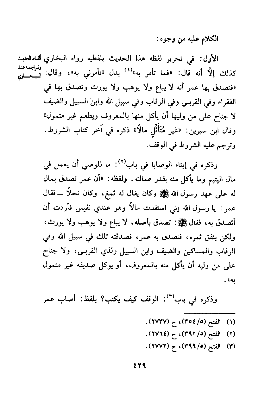 الأول: في تحرير لفظه هذا الحديث بلفظيه رواه البخاري كذلك إلَّا أنه قال: "فما تأمر به" (¬1) بدل "تأمرني به"، وقال: "فتصدق بها عمر أنه لا يباع ولا يوهب ولا يورث وتصدق بها في الفقراء وفي القربى وفي الرقاب وفي سبيل الله وابن السبيل والضيف لا جناح على من وليها أن يأكل منها بالمعروف ويطعم غير متمول" وقال ابن سيرين: "غير مُتَأَثِّلٍ مالًا" ذكره في آخر كتاب الشروط. وترجم عليه الشروط في الوقف.