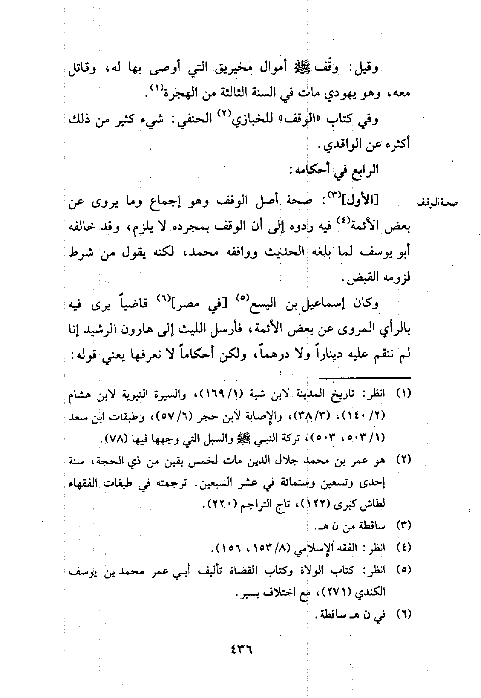[الأول] (¬3): صحة أصل الوقف وهو إجماع وما يروى عن بعض الأئمة (¬4) فيه ردوه إلى أن الوقف بمجرده لا يلزم، وقد خالفه أبو يوسف لما بلغه الحديث ووافقه محمَّد، لكنه يقول من شرط لزومه القبض.