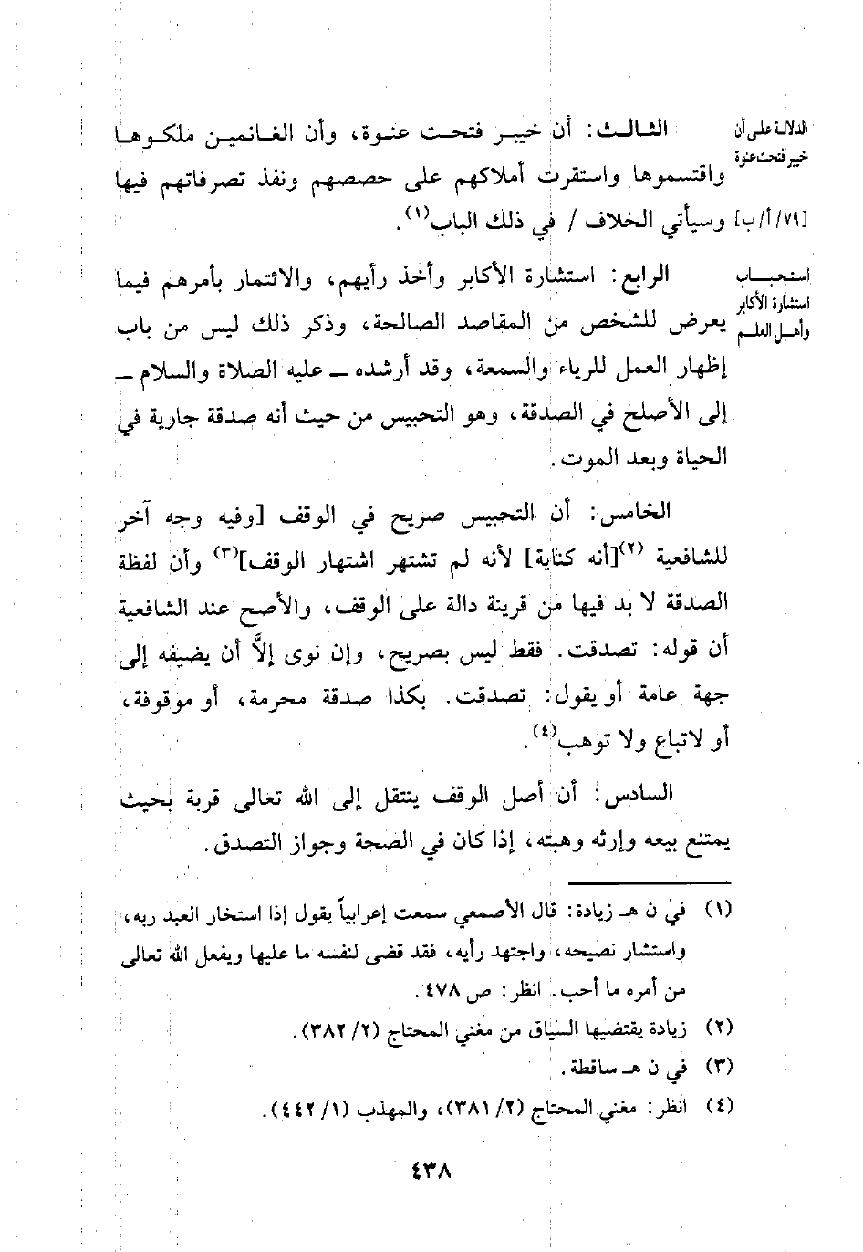 الرابع: استشارة الأكابر وأخذ رأيهم، والائتمار بأمرهم فيما يعرض للشخص من المقاصد الصالحة، وذكر ذلك ليس من باب إظهار العمل للرياء والسمعة، وقد أرشده -عليه الصلاة والسلام- إلى الأصلح في الصدقة، وهو التحبيس من حيث أنه صدقة جارية في الحياة وبعد الموت.