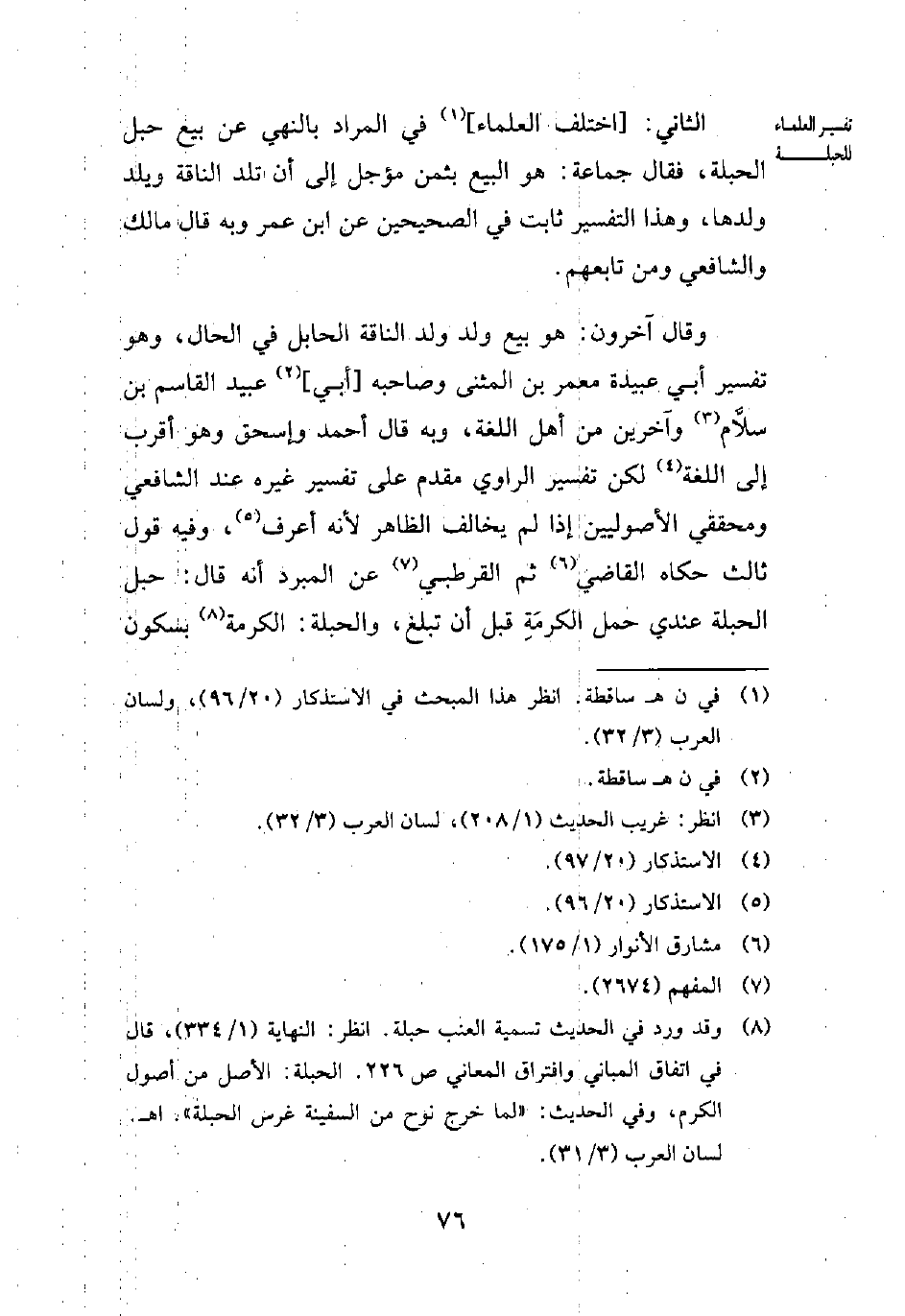 وقال آخرون: هو بيع ولد ولد الناقة الحابل في الحال، وهو تفسير أبي عبيدة معمر بن المثنى وصاحبه [أبي] (¬2) عبيد القاسم بن سلاَّم (¬3) وآخرين من أهل اللغة، وبه قال أحمد وإسحق وهو أقرب إلى اللغة (¬4) لكن تفسير الراوي مقدم على تفسير غيره عند الشافعي ومحققي الأصوليين إذا لم يخالف الظاهر لأنه أعرف (¬5)، وفيه قول ثالث حكاه القاضي (¬6) ثم القرطبي (¬7) عن المبرد أنه قال: حبل الحبلة عندي حمل الكرمَةِ قبل أن تبلغ، والحبلة: الكرمة (¬8) بسكون