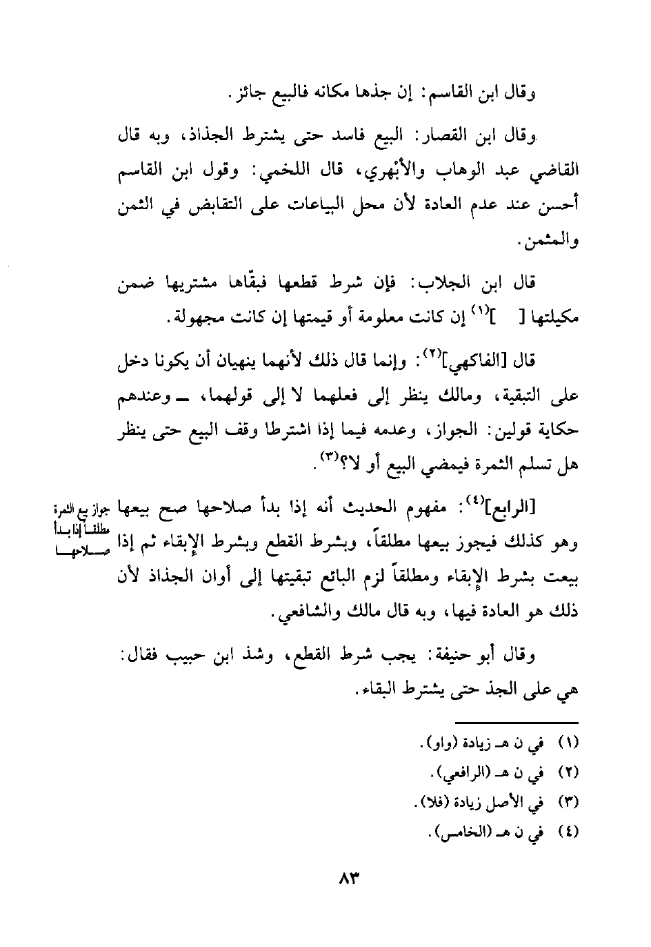 [الرابع] (¬4): مفهوم الحديث أنه إذا بدأ صلاحها صح بيعها وهو كذلك فيجوز بيعها مطلقاً، وبشرط القطع وبشرط الإِبقاء ثم إذا بيعت بشرط الإِبقاء ومطلقاً لزم البائع تبقيتها إلى أوان الجذاذ لأن ذلك هو العادة فيها، وبه قال مالك والشافعي.