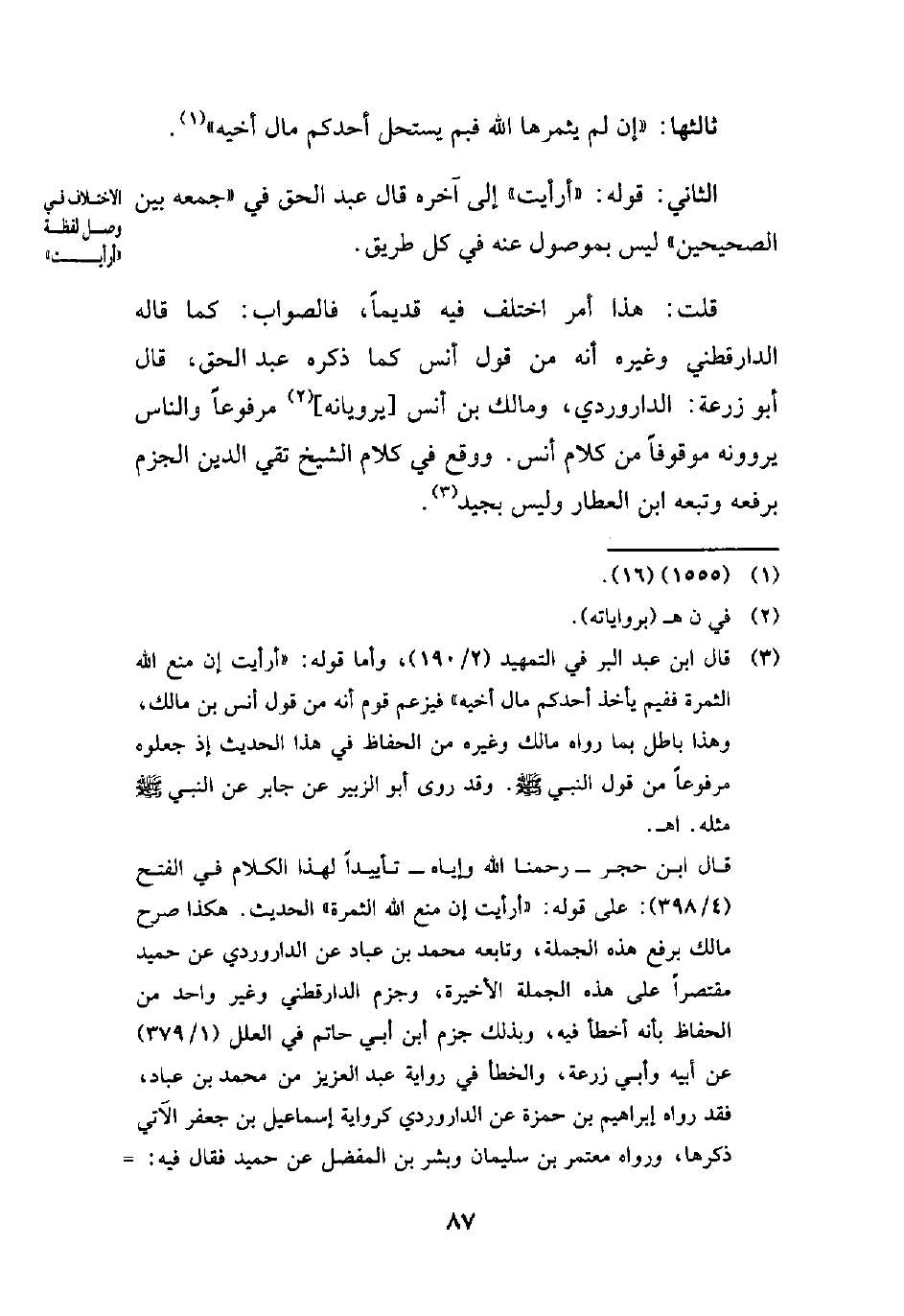 قال ابن حجر -رحمنا الله وإياه- تأييداً لهذا الكلام في الفتح (4/ 398): على قوله: "أرايت إن منع الله الثمرة" الحديث. هكذا صرح مالك برفع هذه الجملة، وتابعه محمد بن عباد عن الداروردي عن حميد مقتصراً على هذه الجملة الأخيرة، وجزم الدارقطني وغير واحد من الحفاظ بأنه أخطأ فيه، وبذلك جزم ابن أبي حاتم في العلل (1/ 379) عن أبيه وأبي زرعة، والخطأ في رواية عبد العزيز من محمد بن عباد، فقد رواه إبراهيم بن حمزة عن الداروردي كرواية إسماعيل بن جعفر الآتي ذكرها، ورواه معتمر بن سليمان وبشر بن المفضل عن حميد فقال فيه: =