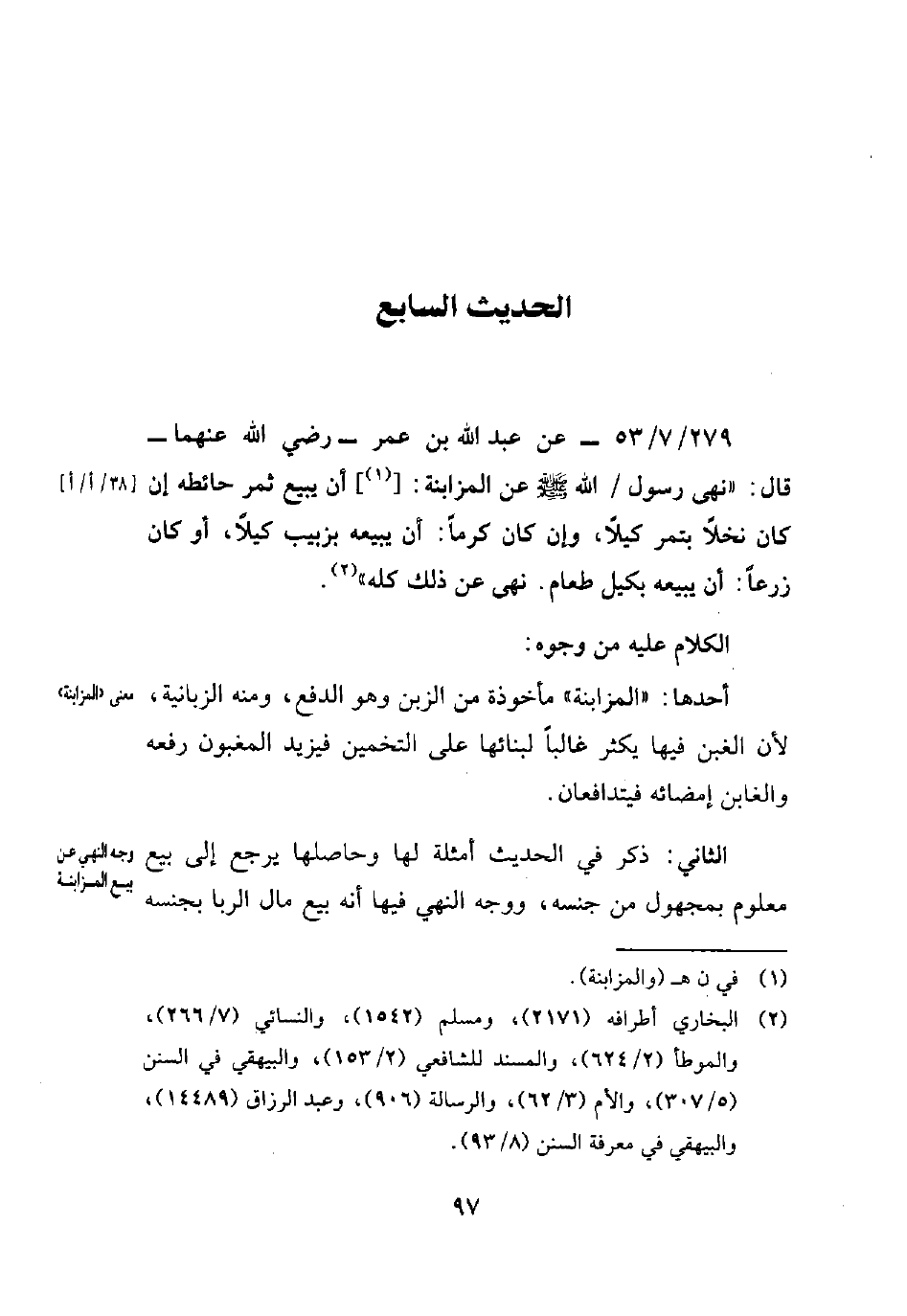 279/ 7/ 53 - عن عبد الله بن عمر -رضي الله عنهما- قال: "نهى رسول الله - صلى الله عليه وسلم - عن المزابنة: [(¬1)] أن يبيع ثمر حائطه إن كان نخلاً بتمر كيلاً، وإن كرماً: أن يبيعه بزبيب كيلاً، أو كان زرعاً: أن يبيعه بكيل طعام. نهى عن ذلك كله" (¬2).