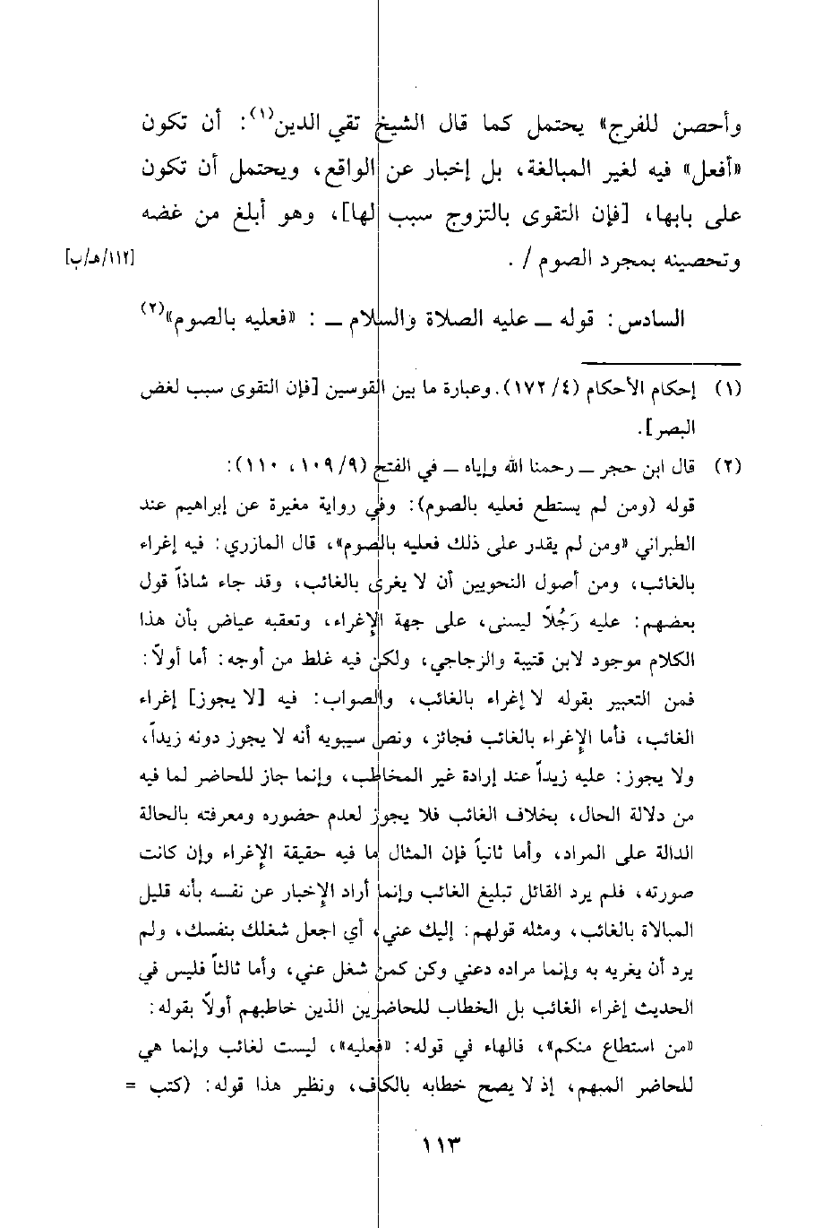 (¬2) قال ابن حجر -رحمنا الله وإياه- في الفتح (9/ 109، 110): قوله (ومن لم يستطع فعليه بالصوم): وفي رواية مغيرة عن إبراهيم عند الطبراني "ومن لم يقدر على ذلك فعليه بالصوم"، قال المازري: فيه إغراء بالغائب، ومن أصول النحويين أن لا يغرى بالغائب، وقد جاء شاذًا قول بعضهم: عليه رَجُلًا ليسنى، على جهة الإِغراء، وتعقبه عياض بأن هذا الكلام موجود لابن قتيبة والزجاجي، ولكن فيه غلط عن وجه: أما أولًا: فمن التعبير بقوله لا إغراء بالغائب، والصواب: فيه [لا يجوز] إغراء الغائب، فأما الإغراء بالغائب فجائز، ونص سيبويه أنه لا يجوز دونه زيدًا، ولا يجوز: عليه زيدًا عند إرادة غير المخاطب، وإنما جاز للحاضر لما فيه من دلالة الحال، بخلاف الغائب فلا يجوز لعدم حضوره ومعرفته بالحالة الدالة على المراد، وأما ثانيًا فإن المثال ما فيه حقيقة الإغراء وإن كانت صورته، فلم يرد القائل تبليغ الغائب وإنما أراد الإِخبار عن نفسه بأنه قليل المبالاة بالغائب، ومثله قولهم: إليك عني، أي اجعل شغلك بنفسك، ولم يرد أن يغريه به وإنما مراده دعني وكن كمن شغل عني، وأما ثالثًا فليس في الحديث إغراء الغائب بل الخطاب للحاضرين الذين خاطبهم أولًا بقوله: "من استطاع منكم"، فالهاء في قوله: "فعليه"، ليست لغائب وإنما هي للحاضر المبهم، إذ لا يصح خطابه بالكاف، ونظير هذا قوله: (كتب =