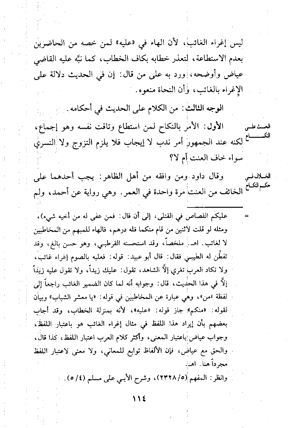 = عليكم القصاص في القتلى، إلى أن قال: فمن عفى له من أخيه شيء)، ومثله لو قلت لاثنين من قام منكما فله درهم، فالهاء للمبهم من المخاطبين لا لغائب. اهـ. ملخصًا، وقد استحسنه القرطبي، وهو حسن بالغ، وقد تفطَّن له الطيبي فقال: قال أبو عبيد: قوله: فعليه بالصوم إغراء غائب، ولا تكاد العرب تغري إلَّا الشاهد، تقول: عليك زيدًا، ولا تقول عليه زيدًا إلَّا في هذا الحديث، قال: وجوابه أنه لما كان الضمير الغائب راجعًا إلى لفظة "من"، وهي عبارة عن المخاطبين في قوله: "يا معشر الشباب" وبيان لقوله: "منكم" جاز قوله: "عليه"، لأنه بمنزلة الخطاب، وقد أجاب بعضهم بأن إيراد هذا اللفظ في مثال إغراء الغائب هو باعتبار اللفظ، وجواب عياض باعتبار المعنى، وأكثر كلام العرب اعتبار اللفظ، كذا قال، والحق مع عياض، فإن الألفاظ توابع للمعاني، ولا معنى لاعتبار اللفظ مجردًا هنا. اهـ.
