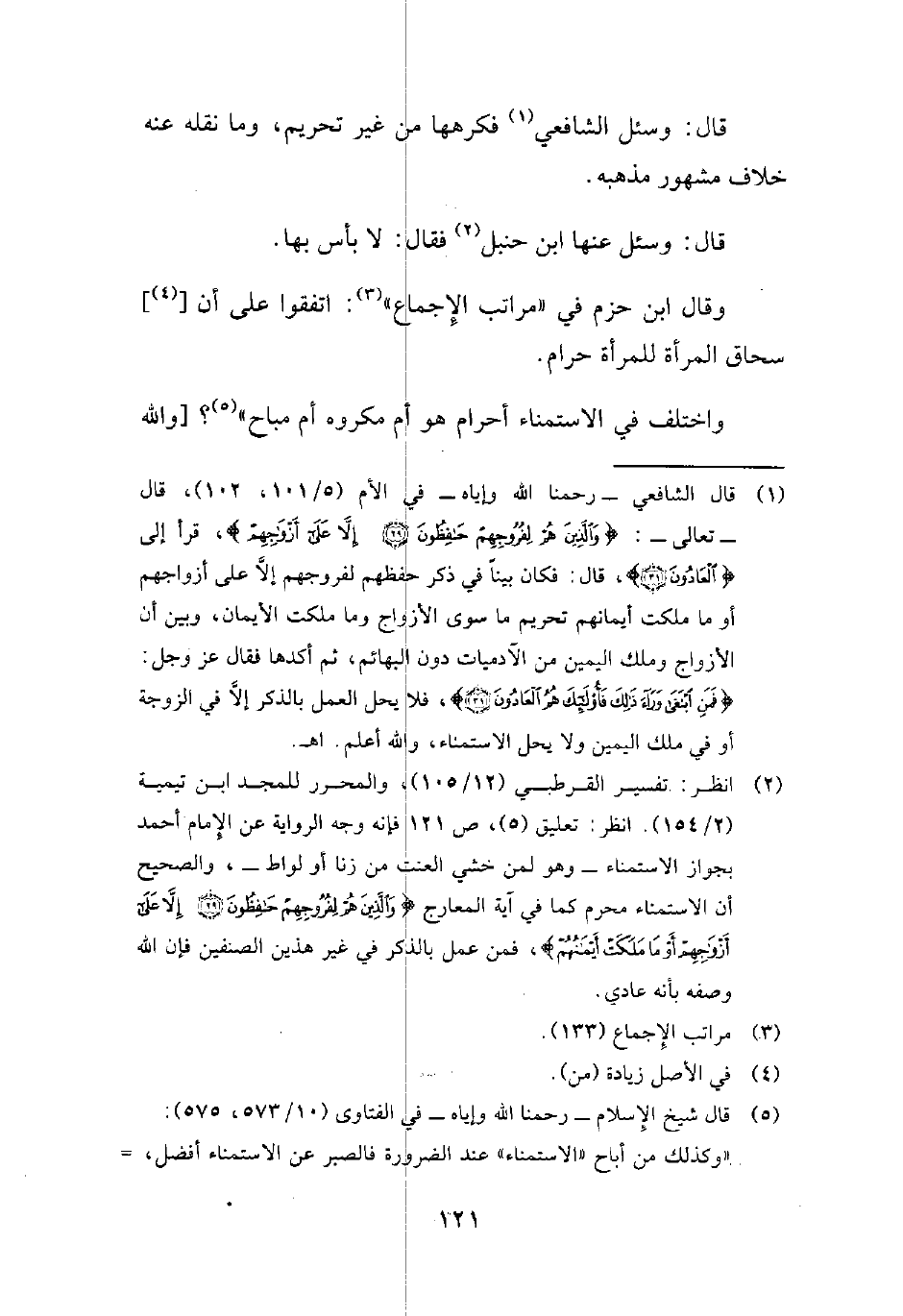 (¬1) قال الشافعي -رحمنا الله وإياه- في الأم (5/ 101، 102)، قال -تعالى-: {وَالَّذِينَ هُمْ لِفُرُوجِهِمْ حَافِظُونَ (29) إِلَّا عَلَى أَزْوَاجِهِمْ}، قرأ إلى {الْعَادُونَ (31)}، قال فكان بينًا في ذكر حفظهم لفروجهم إلَّا على أزواجهم أو ما ملكت أيمانهم تحريم ما سوى الأزواج وما ملكت الأيمان، وبين أن الأزواج وملك اليمين من الآدميات دون البهائم، ثم أكدها فقال عز وجل: {فَمَنِ ابْتَغَى وَرَاءَ ذَلِكَ فَأُولَئِكَ هُمُ الْعَادُونَ (31)}، فلا يحل العمل بالذكر إلَّا في الزوجة أو في ملك اليمين ولا يحل الاستمناء، والله أعلم. اهـ.