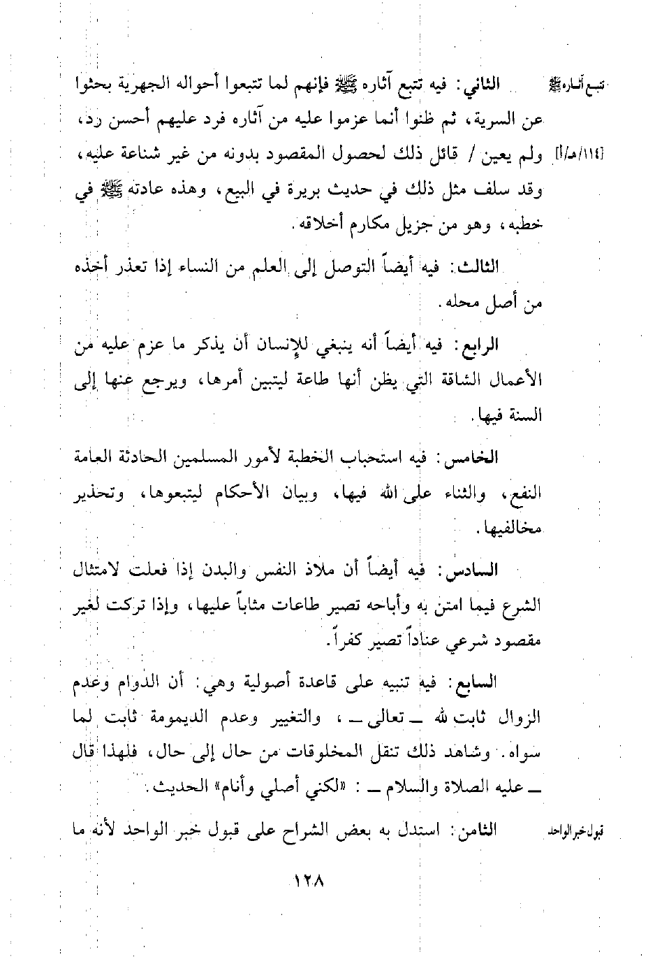 الثاني: فيه تتبع آثاره - صلى الله عليه وسلم - فإنهم لما تتبعوا أحواله الجهرية بحثوا عن السرية، ثم ظنوا أنما عزموا عليه من آثاره فرد عليهم أحسن رد، ولم يعين قائل ذلك لحصول المقصود بدونه من غير شناعة عليه، وقد سلف مثل ذلك في حديث بريرة في البيع، وهذه عادته - صلى الله عليه وسلم - في خطبه، وهو من جزيل مكارم أخلاقه.