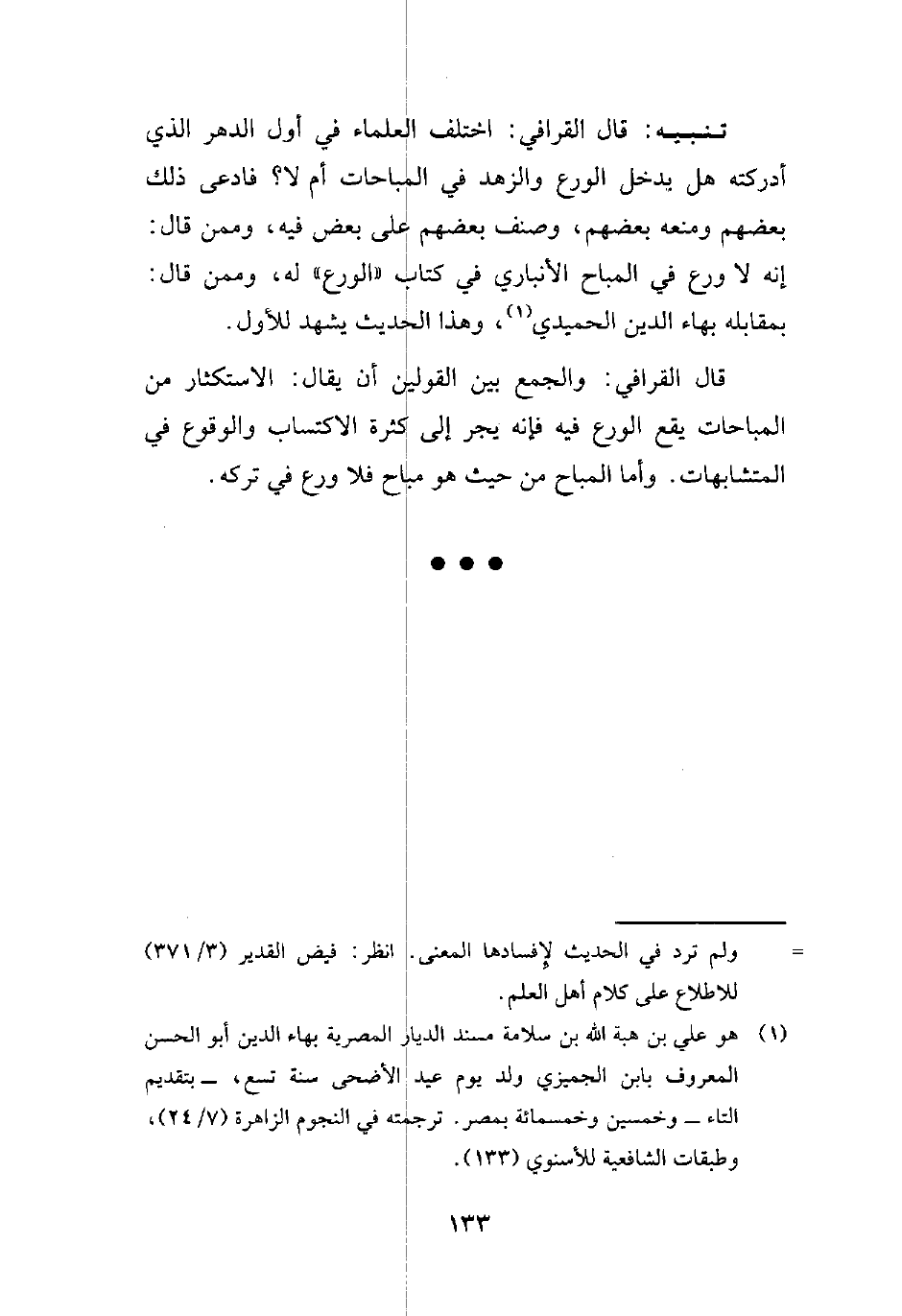 تنبيه: قال القرافي: اختلف العلماء في أول الدهر الذي أدركته هل يدخل الورع والزهد في المباحات أم لا؟ فادعى ذلك بعضهم ومنعه بعضهم، وصنف بعضهم على بعض فيه، وممن قال: إنه لا ورع في المباح الأنباري في كتاب "الورع" له، وممن قال: بمقابله بهاء الدين الحميدي (¬1)، وهذا الحديث يشهد للأول.