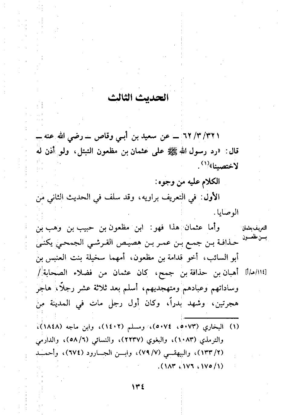321/ 3/ 62 - عن سعيد بن أبي وقاص - رضي الله عنه - قال: "رد رسول الله - صلى الله عليه وسلم - على عثمان بن مظعون التبتل، ولو أذن له لاختصينا" (¬1).