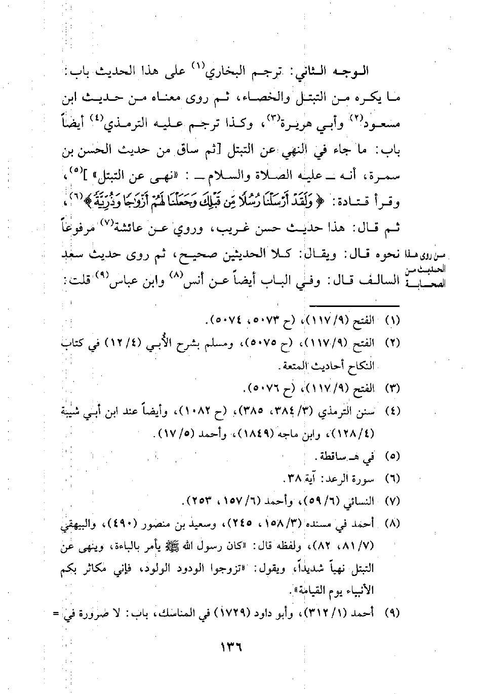 الوجه الثاني: ترجم البخاري (¬1) على هذا الحديث باب: ما يكره من التبتل والخصاء، ثم روى معناه من حديث ابن مسعود (¬2) وأبي هريرة (¬3)، وكذا ترجم عليه الترمذي (¬4) أيضًا باب: ما جاء في النهي عن التبتل [ثم ساق من حديث الحسن بن سمرة، أنه -عليه الصلاة والسلام-: "نهى عن التبتل"] (¬5)، وقرأ قتادة: {وَلَقَدْ أَرْسَلْنَا رُسُلًا مِنْ قَبْلِكَ وَجَعَلْنَا لَهُمْ أَزْوَاجًا وَذُرِّيَّةً} (¬6)، ثم قال: هذا حديث حسن غريب، وروي عن عائشة (¬7) مرفوعًا نحوه قال: ويقال: كلا الحديثين صحيح، ثم روى حديث سعد السالف قال: وفي الباب أيضًا عن أنس (¬8) وابن عباس (¬9) قلت: