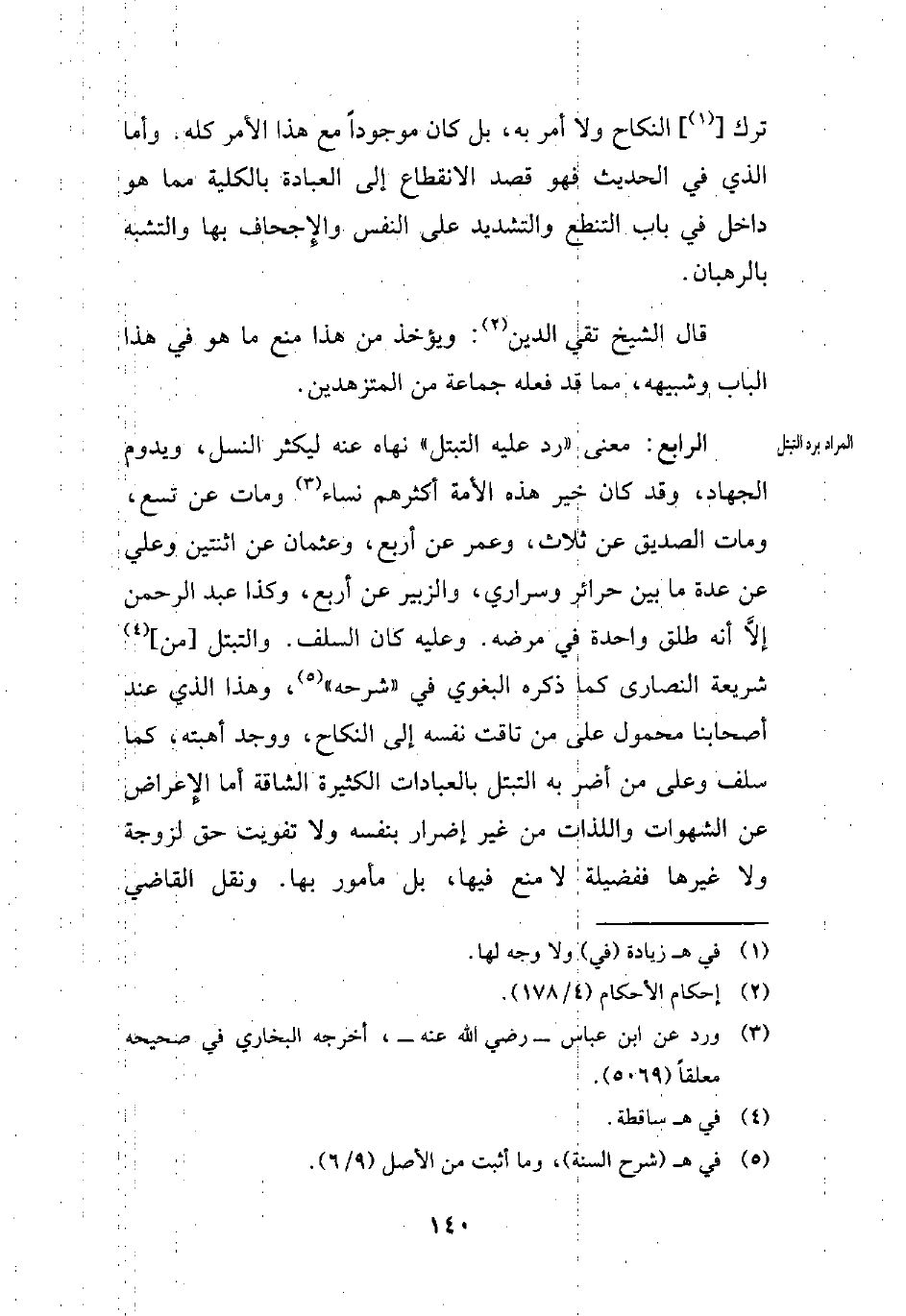الرابع: معنى "رد عليه التبتل" نهاه عنه ليكثر النسل، ويدوم الجهاد، وقد كان خير هذه الأمة أكثرهم نساء (¬3) ومات عن تسع، ومات الصديق عن ثلاث، وعمر عن أربع، وعثمان عن اثنتين وعلي عن عدة ما بين حرائر وسراري، والزبير عن أربع، وكذا عبد الرحمن إلَّا أنه طلق واحدة في مرضه. وعليه كان السلف. والتبتل [من] (¬4) شريعة النصارى كما ذكره البغوي في "شرحه" (¬5)، وهذا الذي عند أصحابنا محمول على من تاقت نفسه إلى النكاح، ووجد أهبته، كما سلف وعلى من أضر به التبتل بالعبادات الكثيرة الشاقة أما الإِعراض عن الشهوات واللذات من غير إضرار بنفسه ولا تفويت حق لزوجة ولا غيرها ففضيلة لا منع فيها، بل مأمور بها. ونقل القاضي
