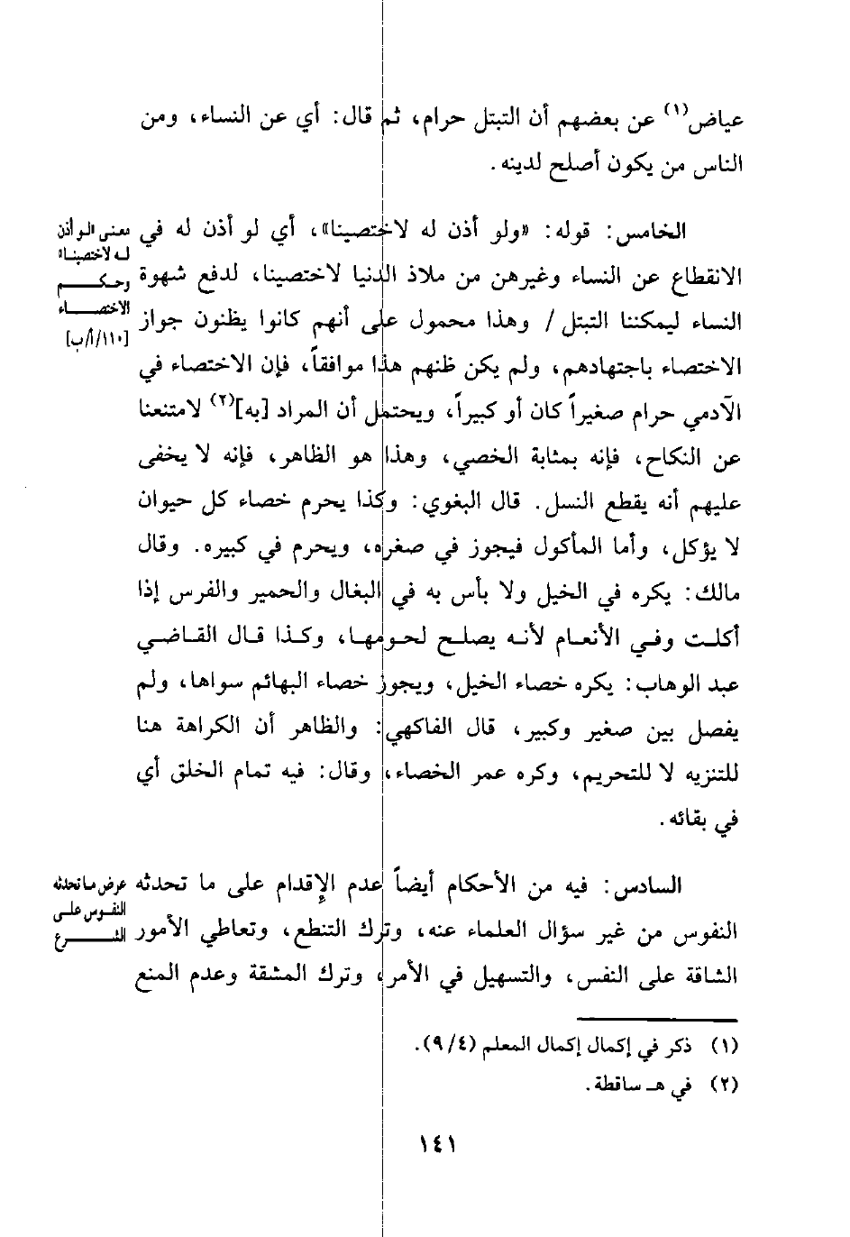 الخامس: قوله: "ولو أذن له لاختصينا"، أي لو أذن له في الانقطاع عن النساء وغيرهن من ملاذ الدنيا لاختصينا، لدفع شهوة النساء ليمكننا التبتل وهذا محمول على أنهم كانوا يظنون جواز الاختصاء باجتهادهم , ولم يكن ظنهم هذا موافقًا، فإن الاختصاء في الآدمي حرام صغيرًا كان أو كبيرًا، ويحتمل أن المراد [به] (¬2) لامتنعنا عن النكاح، فإنه بمثابة الخصي، وهذا هو الظاهر، فإنه لا يخفى عليهم أنه يقطع النسل. قال البغوي: وكذا يحرم خصاء كل حيوان لا يؤكل، وأما المأكول فيجوز في صغره، ويحرم في كبيره. وقال مالك: يكره في الخيل ولا بأس به في البغال والحمير والفرس إذا أكلت وفي الأنعام لأنه يصلح لحومها، وكذا قال القاضي عبد الوهاب: يكره خصاء الخيل، ويجوز خصاء البهائم سواها, ولم يفصل بين صغير وكبير، قال الفاكهي: والظاهر أن الكراهة هنا للتنزيه لا للتحريم، وكره عمر الخصاء، وقال: فيه تمام الخلق أي في بقائه.