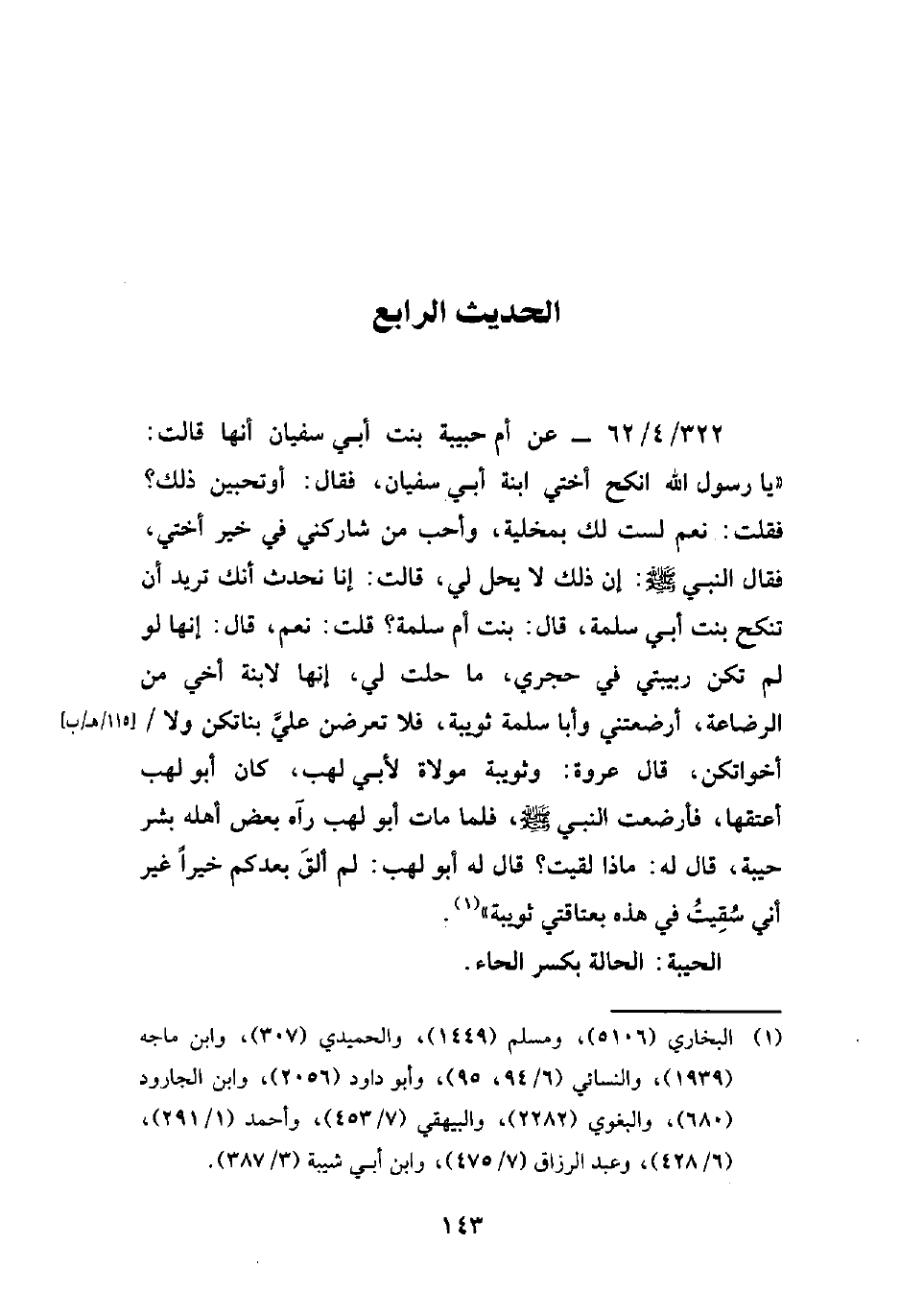 322/ 4/ 62 - عن أم حبيبة بنت أبي سفيان أنها قالت: "يا رسول الله انكح أختي ابنة أبي سفيان، فقال: أو تحبين ذلك؟ فقلت: نعم لست لك بمخلية، وأحب من شاركني في خير أختي، فقال النبي - صلى الله عليه وسلم -: إن ذلك لا يحل لي، قالت: إنا نحدث أنك تريد أن تنكح بنت أبي سلمة، قال: بنت أم سلمة؟ قلت: نعم، قال: إنها لو لم تكن ربيبتي في حجري، ما حلت لي، إنها لابنة أخي من الرضاعة، أرضعتني وأبا سلمة ثويبة، فلا تعرضن عليَّ بناتكن ولا أخواتكن، قال عروة: وثويبة مولاة لأبي لهب، كان أبو لهب أعتقها، فأرضعت النبي - صلى الله عليه وسلم -، فلما مات أبو لهب رآه بعض أهله بشر حيبة، قال له: ماذا لقيت؟ قال له أبو لهب: لم ألقَ بعدكم خيرًا غير أني سُقِيتُ في هذه بعتاقتي ثويبة" (¬1).