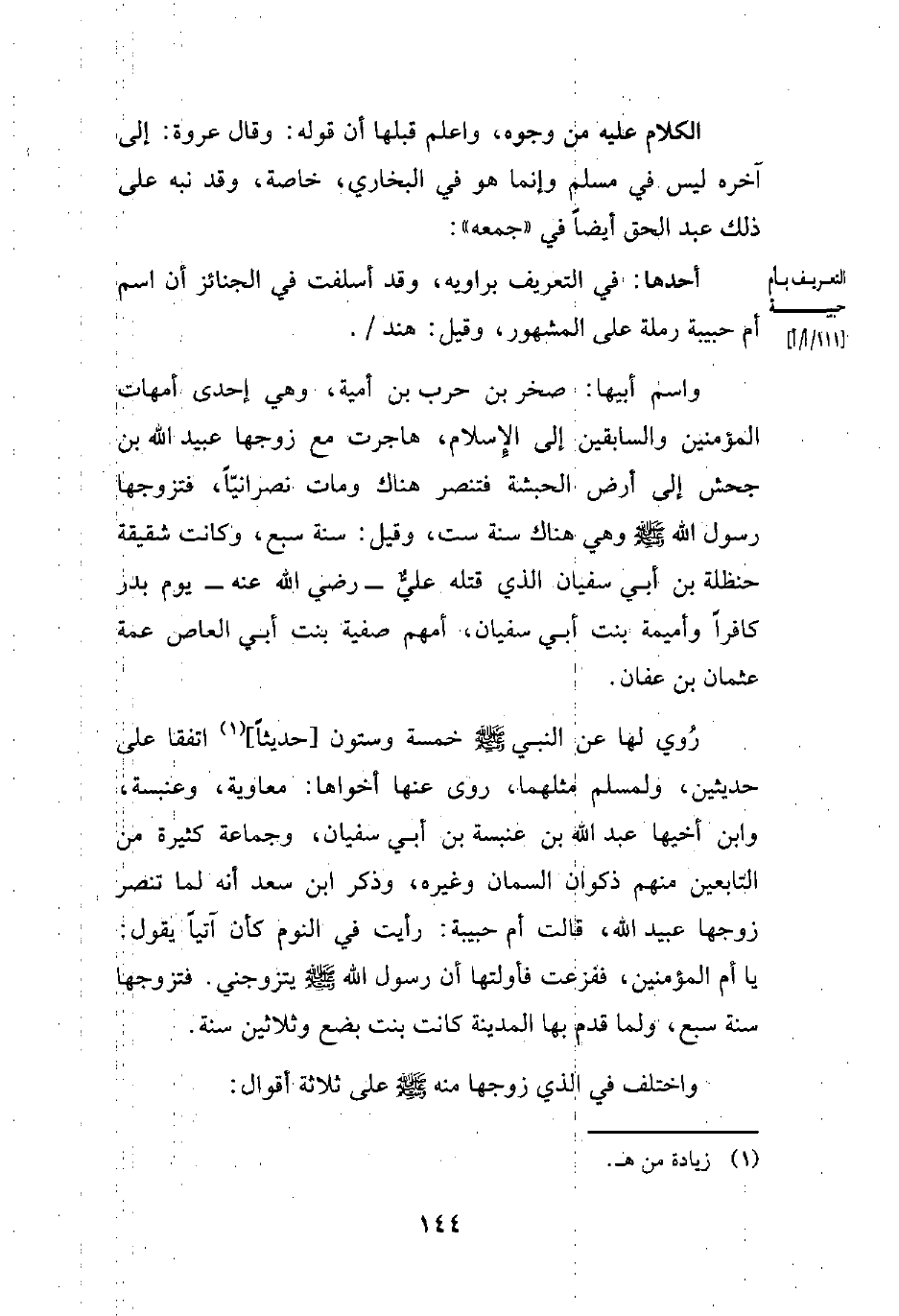رُوي لها عن النبي - صلى الله عليه وسلم - خمسة وستون [حديثًا] (¬1) اتفقا على حديثين، ولمسلم مثلهما، روى عنها أخواها: معاوية، وعنبسة، وابن أخيها عبد الله بن عنبسة بن أبي سفيان، وجماعة كثيرة من التابعين منهم ذكوان السمان وغيره، وذكر ابن سعد أنه لما تنصر زوجها عبيد الله، قالت أم حبيبة. رأيت في النوم كأن آتيًا يقول: يا أم المؤمنين، ففزعت فأولتها أن رسول الله - صلى الله عليه وسلم - يتزوجني. فتزوجها سنة سبع، ولما قدم بها المدينة كانت بنت بضع وثلاثين سنة.