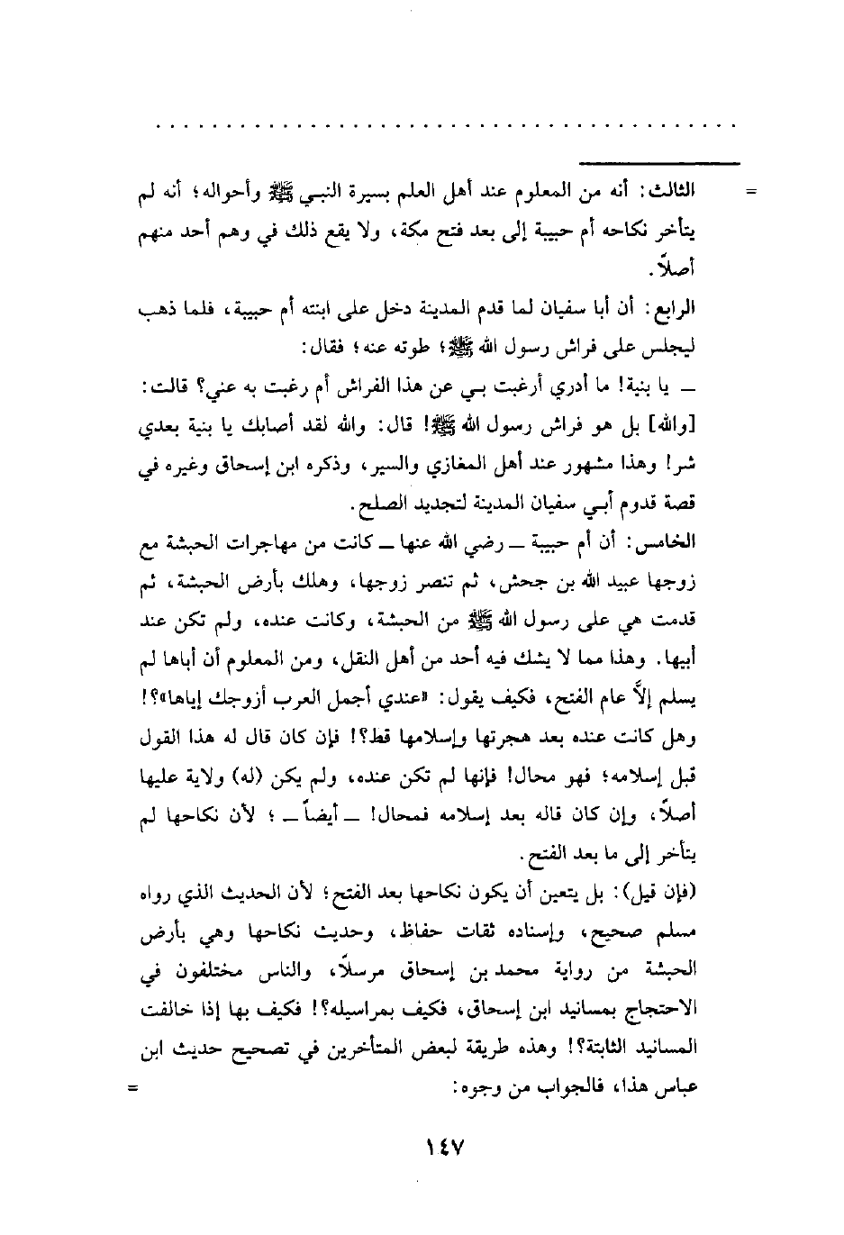 = الثالث: أنه من المعلوم عند أهل العلم بسيرة النبي - صلى الله عليه وسلم - وأحواله؛ أنه لم يتأخر نكاحه أم حبيبة إلى بعد فتح مكة، ولا يقع ذلك في وهم أحد منهم أصلًا.