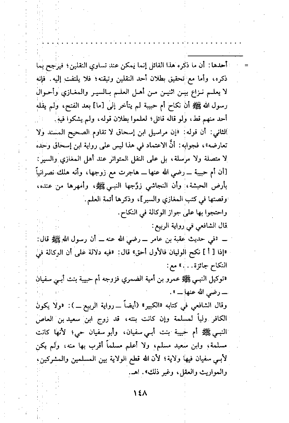 = أحدها: أن ما ذكره هذا القائل إنما يمكن عند تساوي النقلين؛ فيرجح بما ذكره، وأما مع تحقيق بطلان أحد النقلين وتيقنه؛ فلا يلتفت إليه. فإنه لا يعلم نزاع بين اثنين من أهل العلم بالسير والمغازي وأحوال رسول الله - صلى الله عليه وسلم - أن نكاح أم حبيبة لم يتأخر إلى [ما] بعد الفتح، ولم يقله أحد منهم قط، ولو قاله قائل؛ لعلموا بطلان قوله، ولم يشكوا فيه.