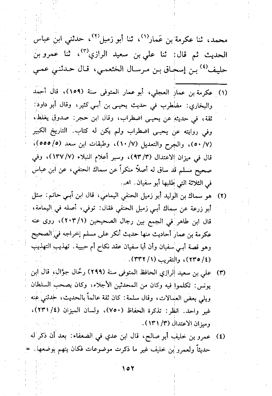 (¬1) عكرمة بن عمار العجلي، أبو عمار المتوفى سنة (159)، قال أحمد والبخاري: مضطرب في حديث يحيى بن أبي كثير، وقال أبو داود: ثقة، في حديثه عن يحيى اضطراب، وقال ابن حجر: صدوق يغلط، وفي روايته عن يحيى اضطراب ولم يكن له كتاب. التاريخ الكبير (7/ 50)، والجرح والتعديل (7/ 10)، وطبقات ابن سعد (5/ 555)، قال في ميزان الاعتدال (3/ 93)، وسير أعلام النبلاء (7/ 137)، وفي صحيح مسلم قد ساق له أصلًا منكرًا عن سماك الحنفي، عن ابن عباس في الثلاثة التي طلبها أبو سفيان. اهـ.