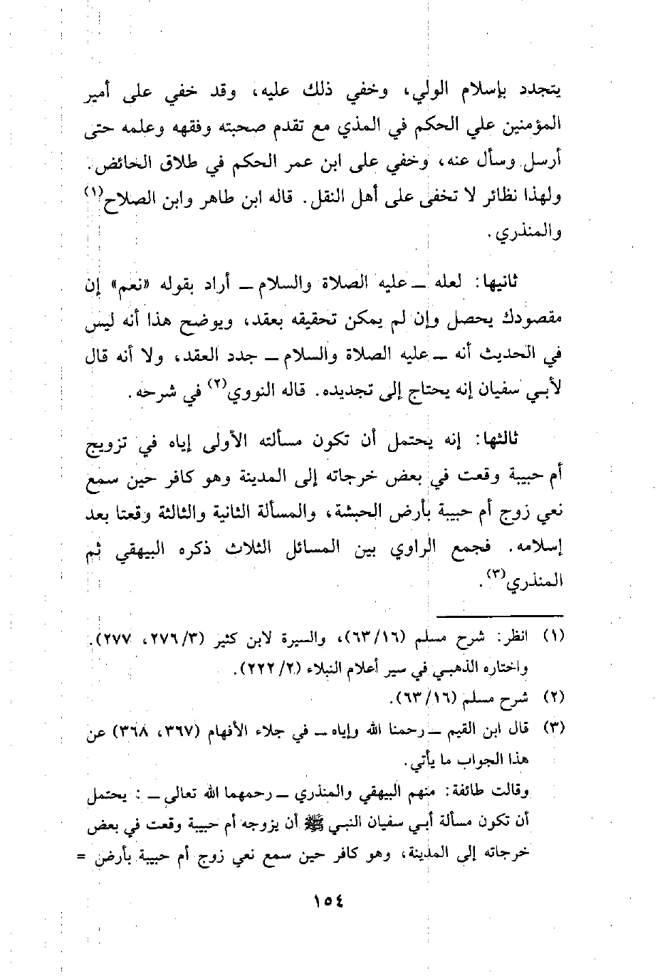 ثالثها: إنه يحتمل أن تكون مسألته الأولى إياه في تزويج أم حبيبة وقعت في بعض خرجاته إلى المدينة وهو كافر حين سمع نعي زوج أم حبيبة بأرض الحبشة، والمسألة الثانية والثالثة وقعتا بعد إسلامه. فجمع الراوي بين المسائل الثلاث ذكره البيهقي ثم المنذري (¬3).