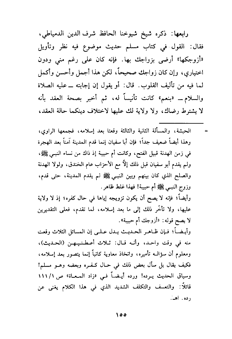 وأيضًا؛ فإن ظاهر الحديث يدل على إن المسائل الثلاث وقعت منه في وقت واحد، وأنه قال: ثلاث أعطنيهن (الحديث)، ومعلوم أن سؤاله تأميره، واتخاذ معاوية كاتبًا إنما يتصور بعد إسلامه، فكيف يقال بل سأل بعض ذلك في حال كفره وبعضه وهو مسلم! وسياق الحديث يرده! ورده أيضًا في "زاد المعاد" ص 1/ 111 قائلًا: والتعسف والتكلف الشديد الذي في هذا الكلام يغني عن رده. اهـ