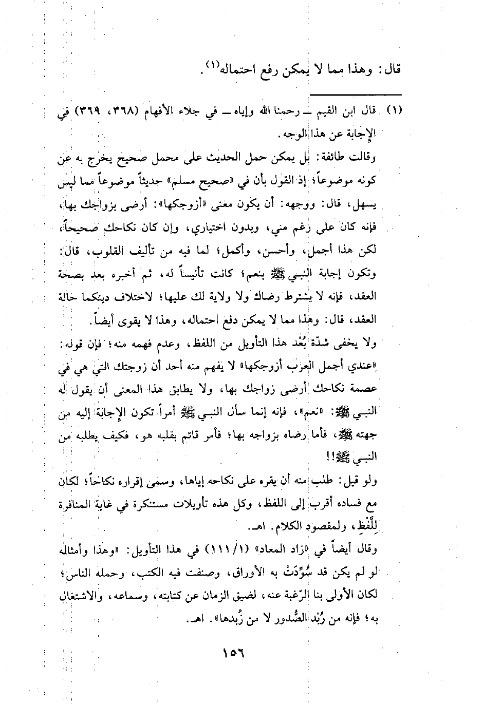وقال أيضًا في "زاد المعاد" (1/ 111) في هذا التأويل: "وهذا وأمثاله لو لم يكن قد سُوِّدَتْ به الأوراق، وصنفت فيه الكتب، وحمله الناس؛ لكان الأولى بنا الرّغبة عنه، لضيق الزمان عن كتابته، وسماعه، والاشتغال به؛ فإنه من رُبد الصُّدور لا من زُبدها". اهـ.
