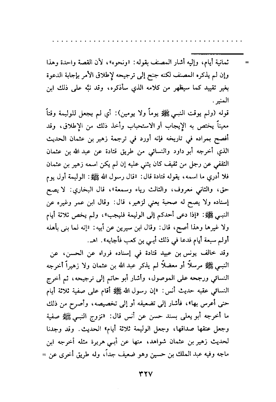 وقد خالف يونس بن عبيد قتادة في إسناده فرواه عن الحسن، عن النبي - صلى الله عليه وسلم - مرسلًا أو معضلًا لم يذكر عبد الله بن عثمان ولا زهيرًا أخرجه النسائي ورجحه على الموصول، وأشار أبو حاتم إلى ترجيحه، ثم أخرج النسائي عقبه حديث أنس: "إن رسول الله - صلى الله عليه وسلم - أقام على صفية ثلاثة أيام حتى أعرس بها"، فأشار إلى تضعيفه أو إلى تخصيصه، وأصرح من ذلك ما أخرجه أبو يعلى بسند حسن عن أنس قال: "تزوج النبي - صلى الله عليه وسلم - صفية وجعل عتقها صداقها، وجعل الوليمة ثلاثة أيام" الحديث. وقد وجدنا لحديث زهير بن عثمان شواهد، منها عن أبي هريرة مثله أخرجه ابن ماجه وفيه عبد الملك بن حسين وهو ضعيف جدًا، وله طريق أخرى عن =