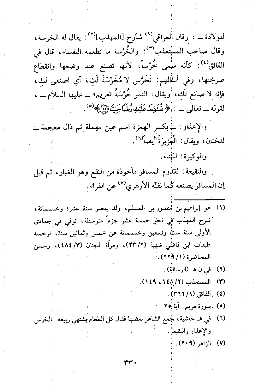 للولادة-، وقال العراقي (¬1) شارح [المهذب] (¬2): يقال له الخرسة، وقال صاحب المستعذب (¬3): والخُرْسة ما تطعمه النفساء، قال في الفائق (¬4): كأنه سمى خُرْسًا، لأنها تصنع عند وضعها وانقطاع صرختها، وفي أمثالهم: تَخَرَّس لا مُخَرِّسَةَ لَكِ، أي اصنعي لكِ، فإنه لا صانع لَكِ، ويقال: التمر خُرْسَةُ "مريم" -عليها السلام-، لقوله -تعالي-: {تُسَاقِطْ عَلَيْكِ رُطَبًا جَنِيًّا (25)} (¬5).
