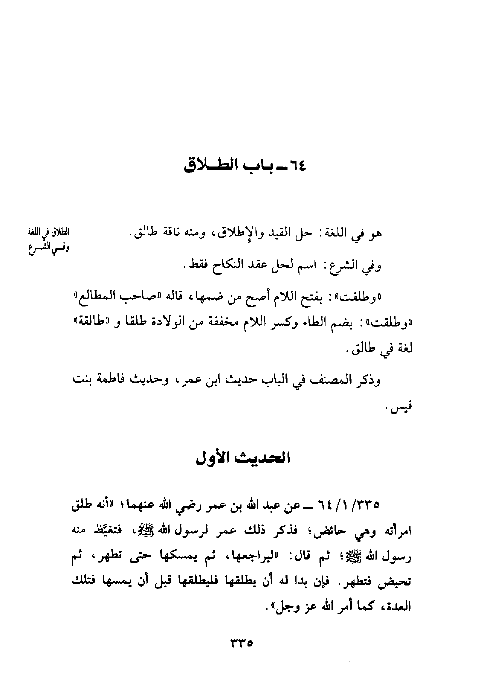 335/ 1/ 64 - عن عبد الله بن عمر رضي الله عنهما؛ "أنه طلق امرأته وهي حائض؛ فذكر ذلك عمر لرسول الله - صلى الله عليه وسلم -، فتغيَّظ منه رسول الله - صلى الله عليه وسلم -؛ ثم قال: "ليراجعها، ثم يمسكها حتى تطهر، ثم تحيض فتطهر. فإن بدا له أن يطلقها فليطلقها قبل أن يمسها فتلك العدة، كما أمر الله عز وجل".