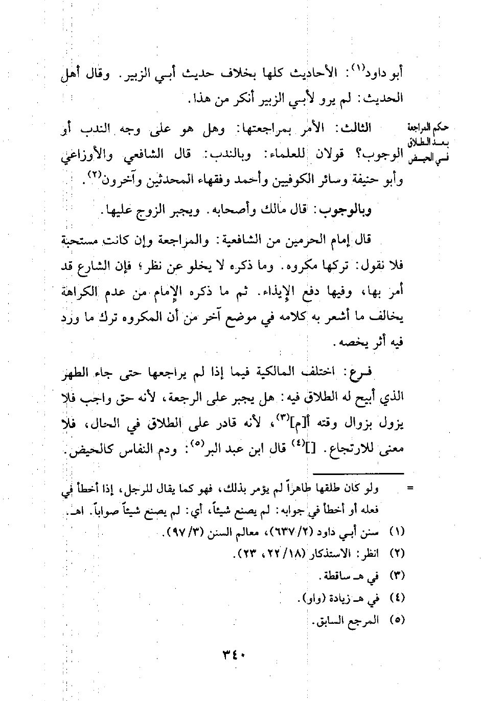 الثالث: الأمر بمراجعتها: وهل هو على وجه الندب أو الوجوب؟ قولان للعلماء: وبالندب: قال الشافعي والأوزاعي وأبو حنيفة وسائر الكوفيين وأحمد وفقهاء المحدثين وآخرون (¬2).