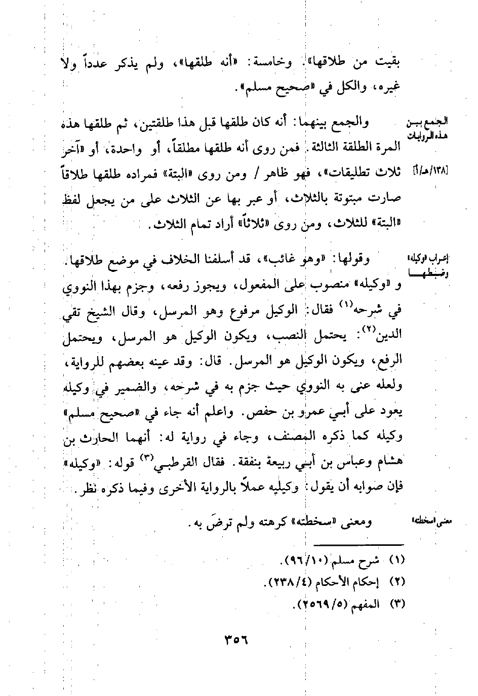 وقولها: "وهو غائب"، قد أسلفنا الخلاف في موضع طلاقها. و "وكيله" منصوب على المفعول، ويجوز رفعه، وجزم بهذا النووي في شرحه (¬1) فقال: الوكيل مرفوع وهو المرسل، وقال الشيخ تقي الدين (¬2): يحتمل النصب، ويكون الوكيل هو المرسل، ويحتمل الرفع، ويكون الوكيل هو المرسل. قال: وقد عينه بعضهم للرواية, ولعله عني فيه النووي حيث جزم به في شرحه، والضمير في وكيله يعود على أبي عمرو بن حفص. واعلم أنه جاء في "صحيح مسلم" وكيله كما ذكره المصنف، وجاء في رواية له: أنهما الحارث بن هشام وعباس بن أبي ربيعة بنفقة. فقال القرطبي (¬3) قوله: "وكيله" فإن صوابه أن يقول: وكيليه عملًا بالرواية الأخرى وفيما ذكره نظر.