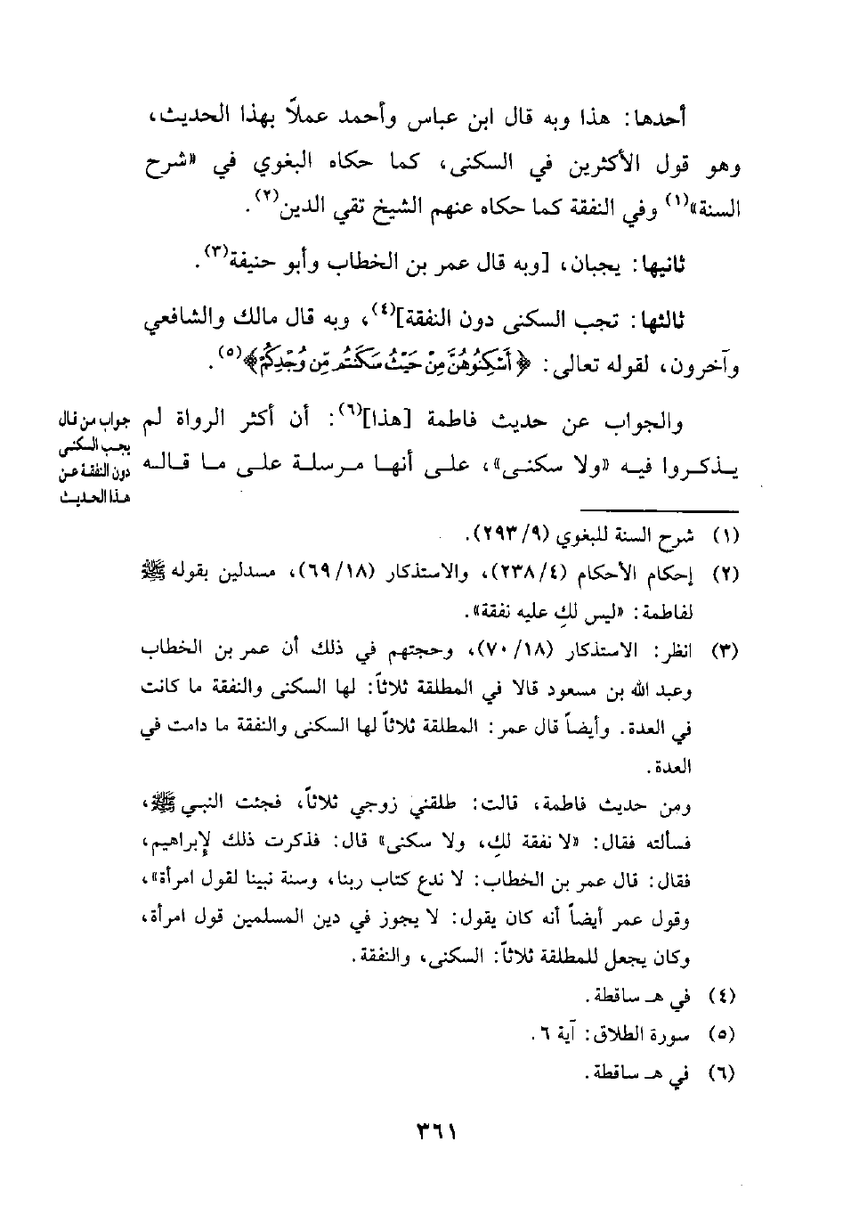 (¬3) انظر: الاستذكار (18/ 70)، وحجتهم في ذلك أن عمر بن الخطاب وعبد الله بن مسعود قالا في المطلقة ثلاثًا: لها السكنى والنفقة ما كانت في العدة. وأيضًا قال عمر: المطلقة ثلاثًا لها السكنى والنفقة ما دامت في العدة.