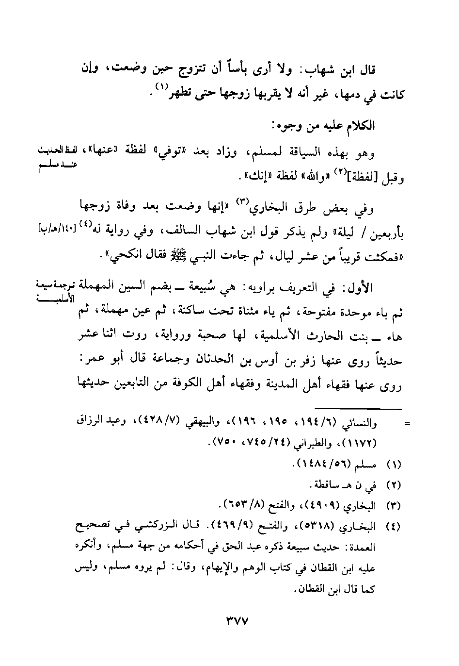 (¬4) البخاري (5318)، والفتح (9/ 469). قال الزركشي في تصحيح العمدة: حديث سبيعة ذكره عبد الحق في أحكامه من جهة مسلم، وأنكره عليه ابن القطان في كتاب الوهم والإيهام، وقال: لم يروه مسلم، وليس كما قال ابن القطان.