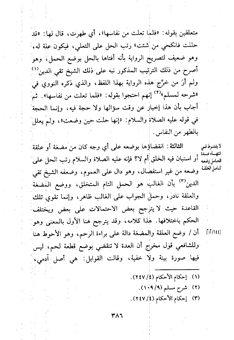 متعلقين بقوله: "فلما تعلت من نفاسها"، أي طهرت , قال لها: "قد حللت فانكحي من شئت" رتب الحل على التعلي، فيكون علة له، وهو ضعيف لتصريح الرواية بأنه أفتاها بالحل بوضع الحمل، وهو أصرح من ذلك الترتيب المذكور نبه على ذلك الشيخ تقي الدين (¬1) ولم أرَ من خرَّج هذه الرواية بهذا اللفظ، والذي ذكره النووي في "شرحه لمسلم" (¬2) إنهم احتجوا بقوله: "فلما تعلت من نفاسها". ثم أجاب بأن هذا إخبار عن وقت سؤالها ولا حجة فيه، وإنما الحجة في قوله -عليه الصلاة والسلام-: "إنها حلت حين وضعت"، ولم يعلل بالطهر من النفاس.
