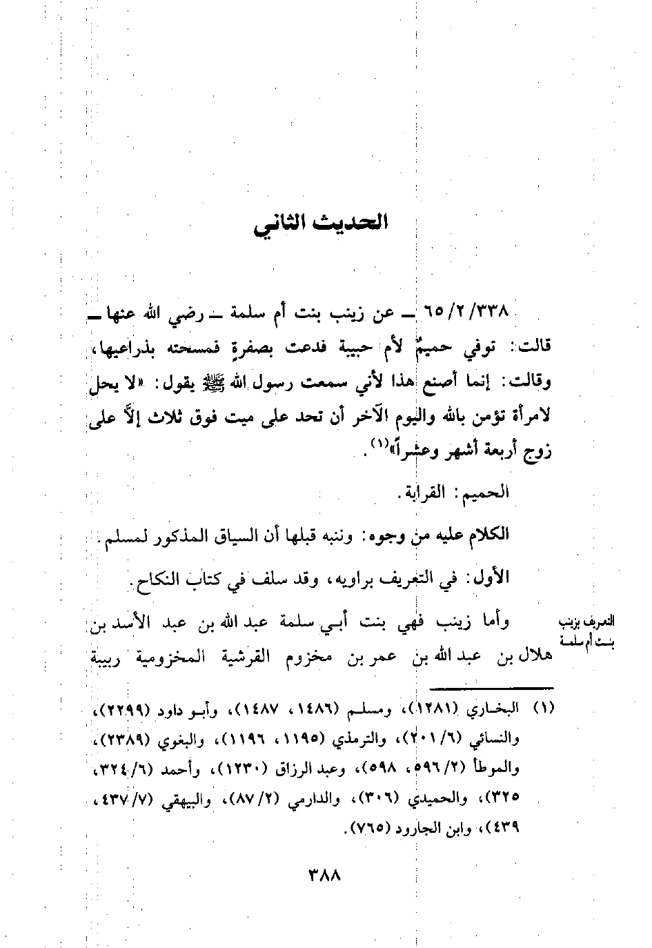 338/ 2/ 65 - عن زينب بنت أم سلمة - رضي الله عنها - قالت: توفي حميمٌ لأم حبيبة فدعت بصفرةٍ فمسحته بذراعيها، وقالت: إنما أصنع هذا لأني سمعت رسول الله - صلى الله عليه وسلم - يقول: "لا يحل لامرأة تؤمن بالله واليوم الآخر أن تحد على ميت فوق ثلاث إلَّا على زوج أربعة أشهر وعشرًا" (¬1).