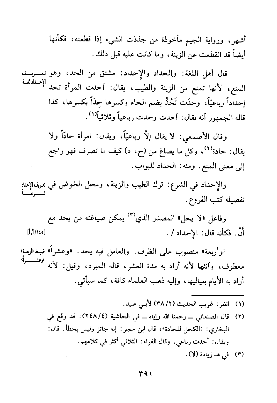 (¬2) قال الصنعاني -رحمنا الله وإياه- في الحاشية (4/ 248): قد وقع في البخاري: "الكحل للحادة"، قال ابن حجر: إنه جائز وليس بخطأ. قال: ويقال: أحدت رباعي. وقال الفراء: الثلاثي أكثر في كلامهم.