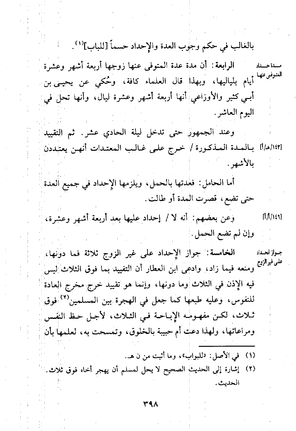 الخامسة: جواز الإحداد على غير الزوج ثلاثة فما دونها، ومنعه فيما زاد، وادعى ابن العطار أن التقييد بما فوق الثلاث ليس فيه الإِذن في الثلاث وما دونها، وإنما هو تقييد خرج مخرج العادة للنفوس، وعليه طبعها كما جعل في الهجرة بين المسلمين (¬2) فوق ثلاث، لكن مفهومه الإِباحة في الثلاث، لأجل حظ النفس ومراعاتها , ولهذا دعت أم حبيبة بالخلوق، وتمسحت به، لعلمها بأن